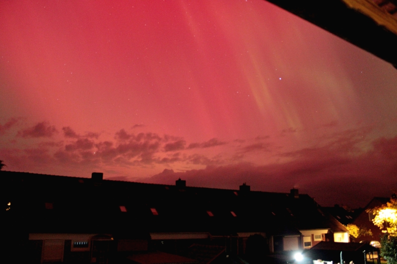 PS. Hier noch eine Aufnahme von dem kurzen Substurm gegen 01:50 MEZ. Da war ich wieder zuhause, deshalb die Aufnahme freihand aus dem Fenster in der Stadt. Canon EOS 2000d bei 18mm.
