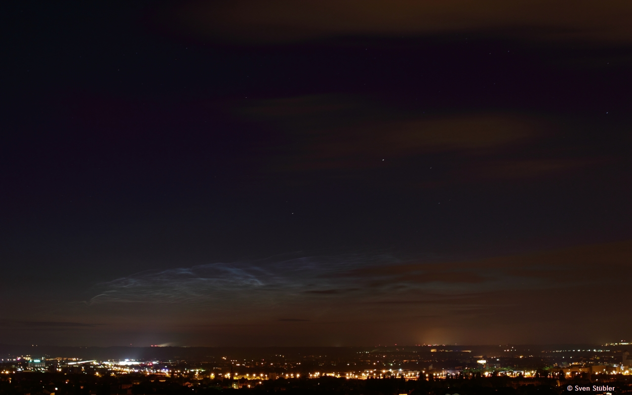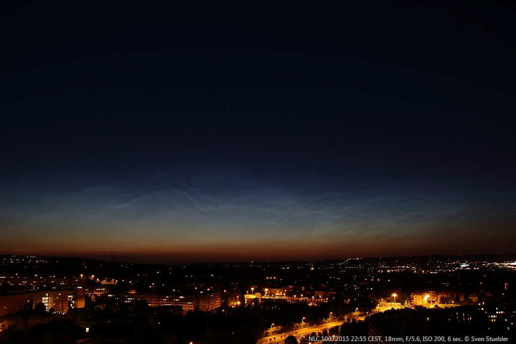Das Bild entstand ca. 22:55 Uhr MESZ. Die Ausdehnung würde ich mal auf Az. 290° - 0° - 30° schätzen, die Helligkeit lag bei 3 - 4 und die Höhe bei ca. 30°.