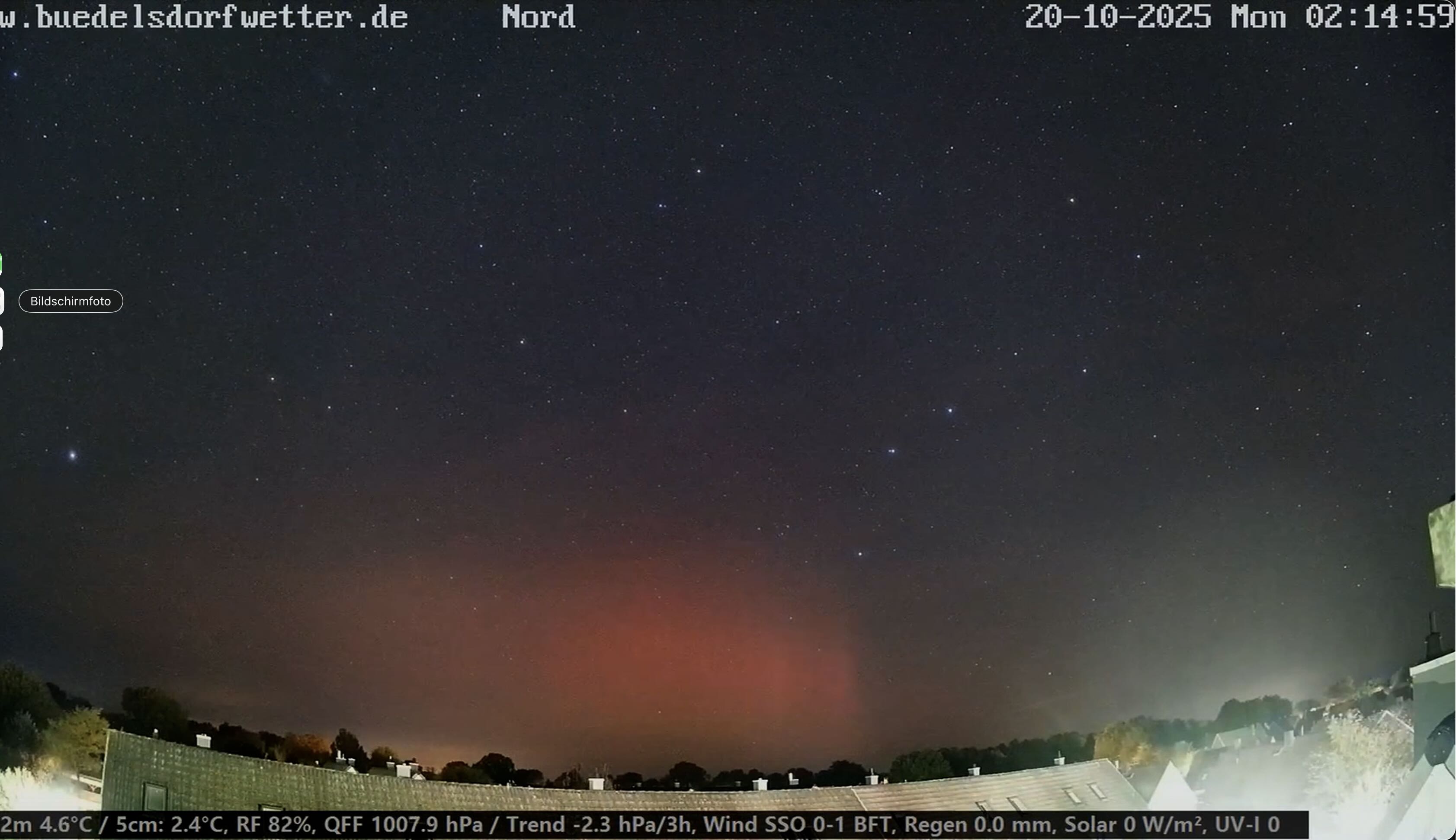 Hallo, Aktuell leichte Polarlicht-Aktivität ab ca. 21:53 MESZ auffällig weit Richtung Nordwesten, schwache rote Beamer, später Richtung Norden wechselnd Screenshot 2025-10-01 215419.jpg Screenshot 2025-10-01 220247.jpg Screenshot 2025-10-01 221613.jpg Screenshot 2025-10-01 224329.jpg Screenshot 2025...