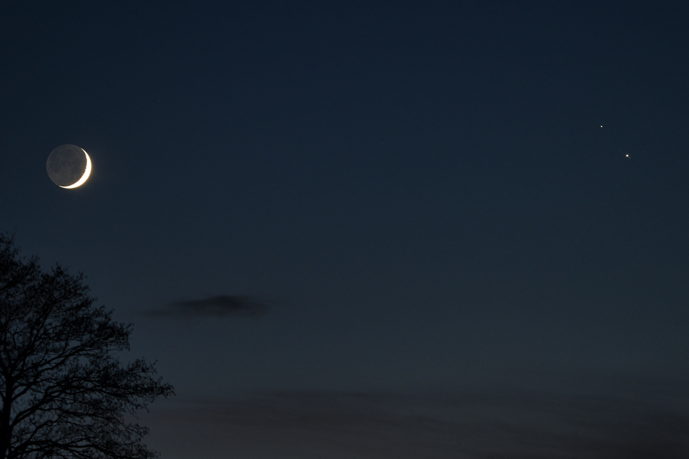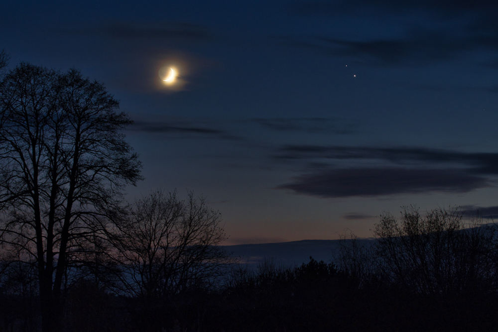 Heute hatte ich endlich die Möglichkeit, dass sich immer näher kommende Planetenpaar zu bewundern. Zunächst hatte ich Sorgen, dass sich die vorhandenen Wolken nicht rechtzeitig verziehen würden. Doch dann kämpfte sich bereits die schmale Mondsichel durch. Und kurze Zeit später waren dann auch Jupite...
