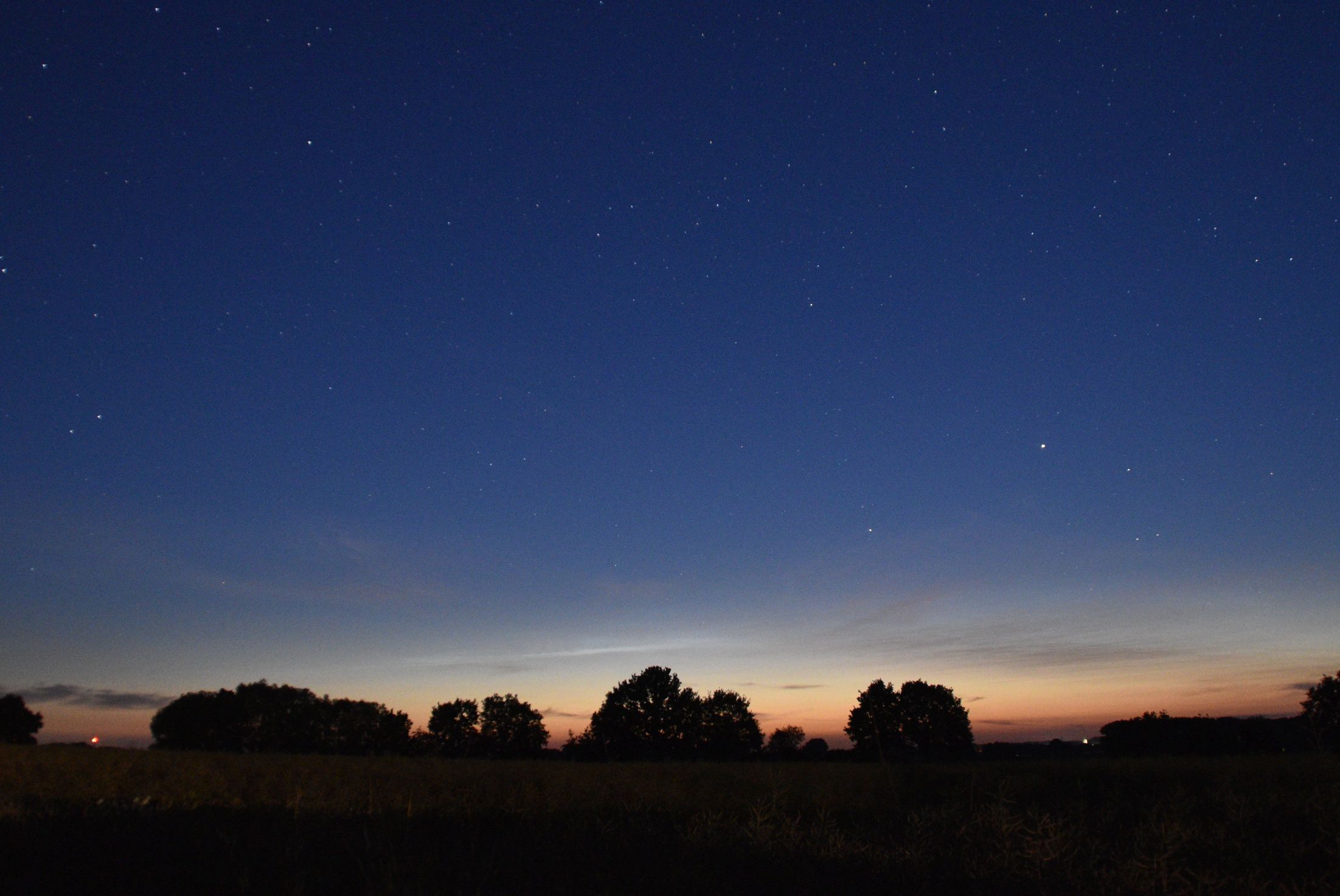 In Offelten,52°17'45.N, 8°30'50E, um 02:26 Uhr eine Ahnung von NLC. Fotografisch sichtbar, vielleicht 5° hoch NNW. f3,5 6sek ISO2000, Nikon D5500. Für die Uhrzeit und den Schlafmangel eigentlich zu wenig.