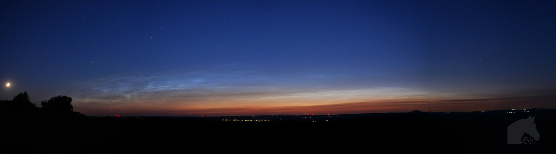 NLC mit Mond Das Panorama bildet den Bereich von ca. 275° bis 40° ab: und noch eine Detailaufnahme: