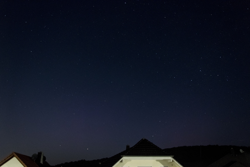 Sehr viele Wolken waren unterwegs. Wegen des vorherigen Regens hat sich an der Fensterscheibe Tau niedergeschlagen. Trotzdem war um 23:47 MEZ Polarlicht fotografisch zu erkennen, leider unscharf.