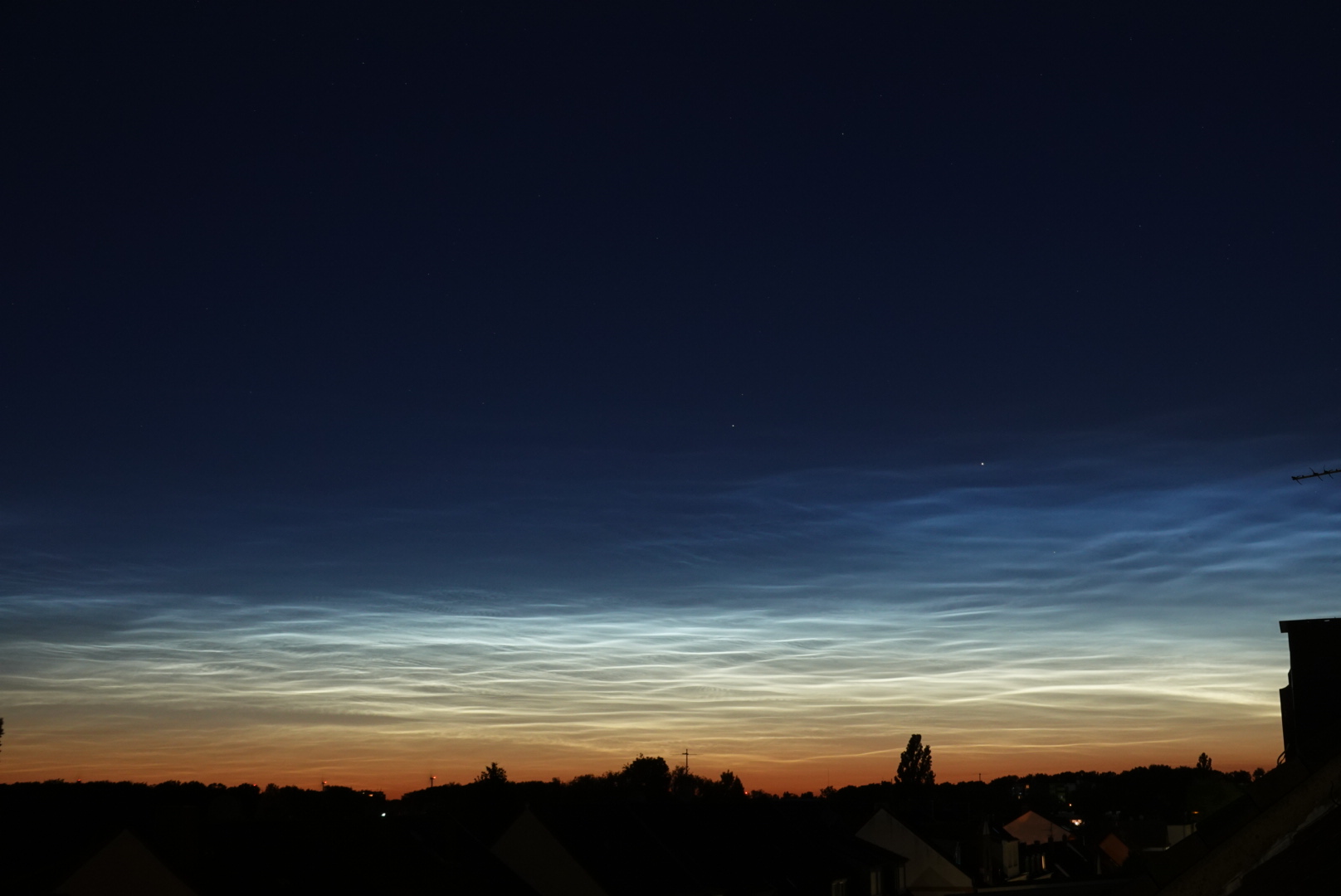 Hier ist noch ein Zeitraffer der letzten Nacht: http://astroyuki.com/Grosse_Bilder/NLC/2019/190705_NLC_TimeLapse.mp4 Links am Horizont sind in der Abenddämmerung auch ganz schwache NLC in den Lücken zu sehen. Schade, dass die rechte Bildhälfte von der Raffinerie GE-Scholven so "hübsch" bel...