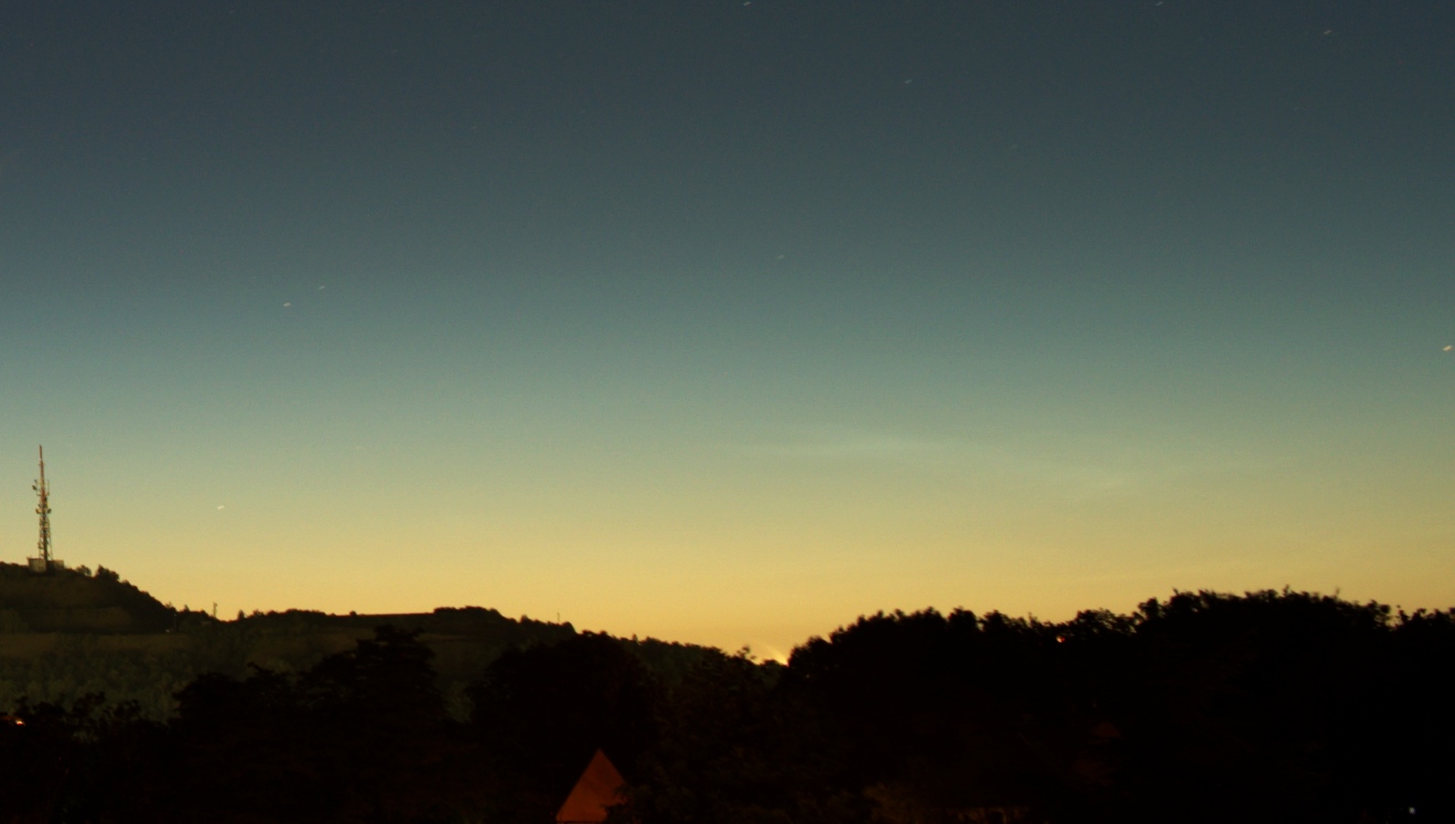 Bild von 3:33 MESZ. Auch in der Abenddämmerung waren in kleinen Wolkenlücken schwache NLC zu sehen.