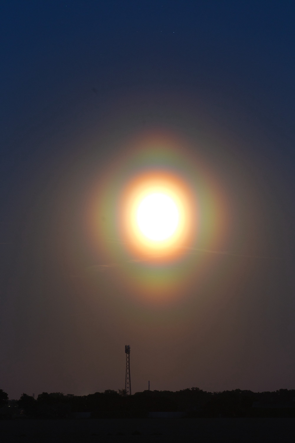 Ich habe noch einen Nachtrag vom Abend des 12. Mai, hier um 22:26 Uhr. Da war die Pollenkorona danke geringer Mondhöhe (knapp unter 5°) noch einmal deutlich heller und kontrastreicher zu erkennen: