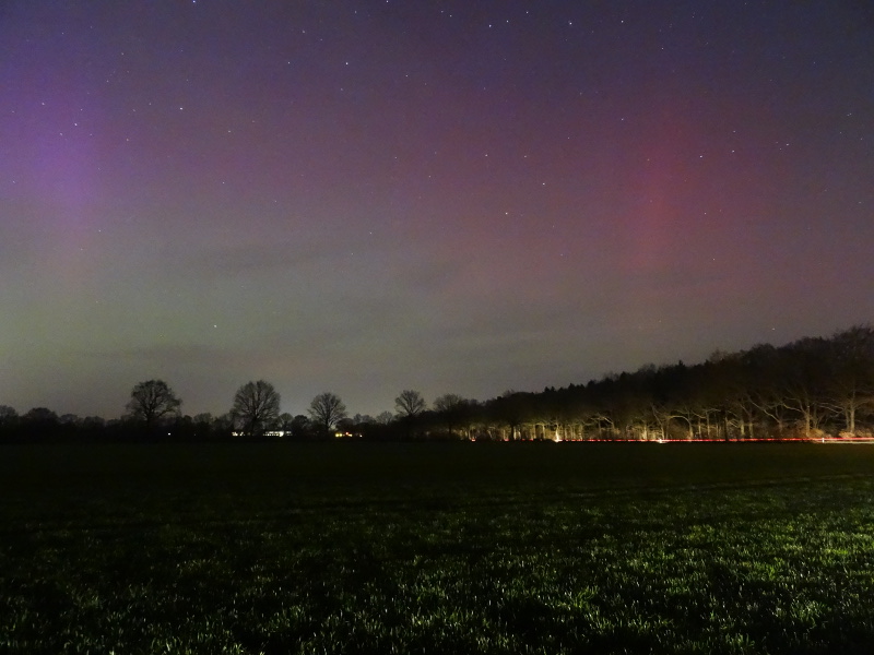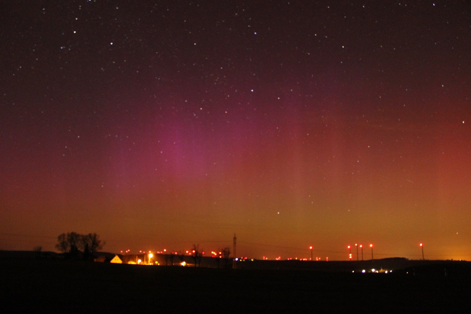 Auch hier im südlichen Thüringen, Nähe Bad Lobenstein war ein farbloses Polarlicht mit Beamern sichtbar. Auf den Fotos rot-violettes Licht mit deutlichen Beamern. Foto(s) folgen noch.