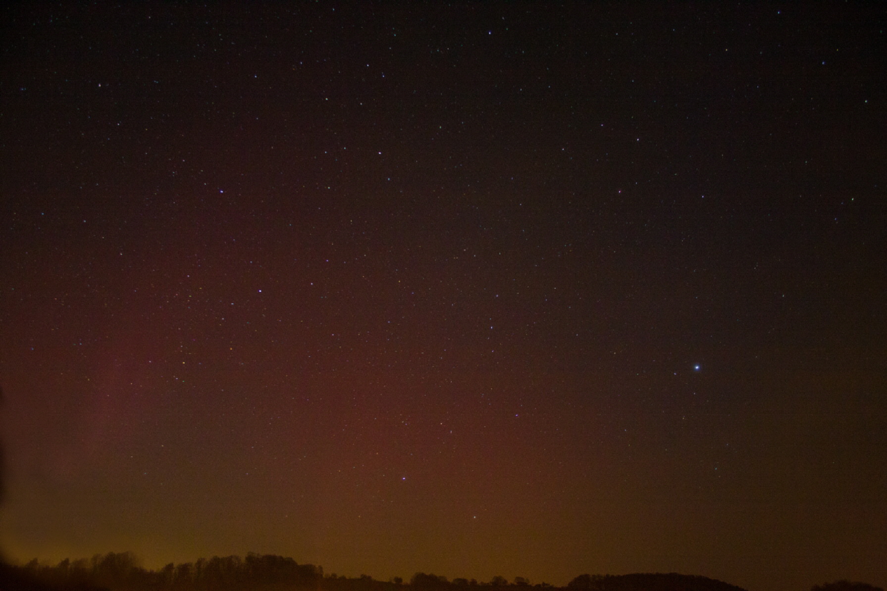 Von ca. 00:00 bis 00:20 fantastischer Strahlenvorhang! Bis ca. 35 Grad hoch. Deutlich visuell. Zeitweise intensives rot mit bloßem Auge sichtbar. Hat jetzt erheblich nachgelassen. Standort: Großer Feldberg bei Frankfurt/Main.