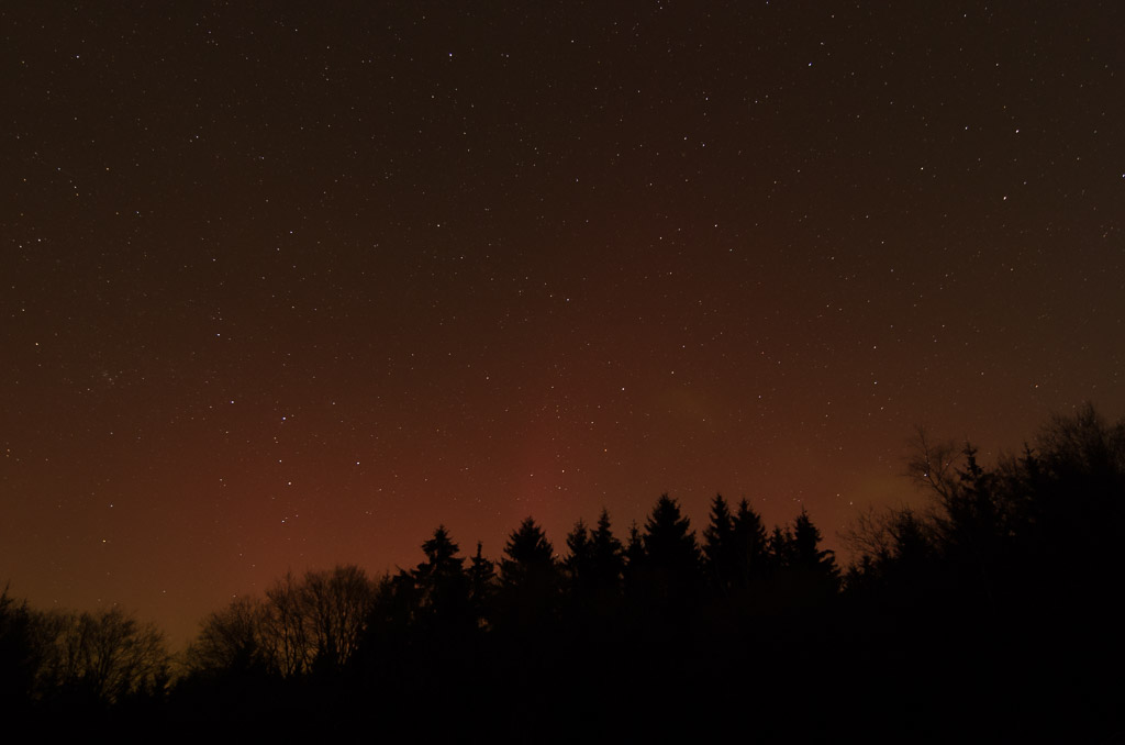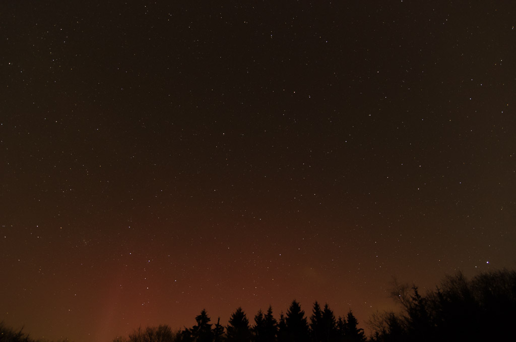 hier noch ein paar Fotos aus dem Taunus, Sandplacken. Das Seeing war gar nicht übel, ein paar Cirren aus Südwest, sonst weitgehend klar. Visuell waren leicht rote Partien und gelegentlich Säulen zu erkennen, deutlicher natürlich auf den Fotos. So richtig beeindruckend wurde es nicht, aber doch ganz nett!