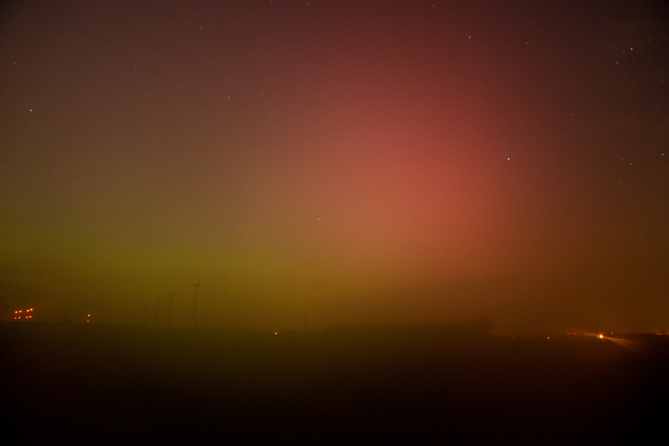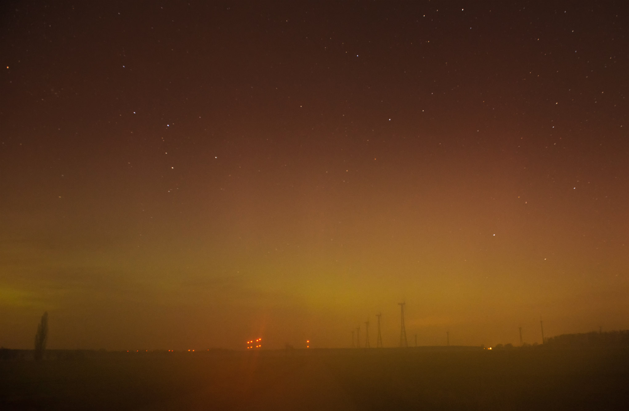 Hier kommt ein Bild von gestern abend aus Linum (Brandenburg) - da stößt die Bridgekamera dann doch an ihre Grenzen, aber zeigen wollte ichs trotzdem..;) Wir waren von 19.40 Uhr bis 20.50 Uhr da - visuell schien der Himmel von Zeit zu Zeit leicht rot aufzuleuchten und heller zu werden, Beamer oder andere Farben haben wir aber nicht gesehen.