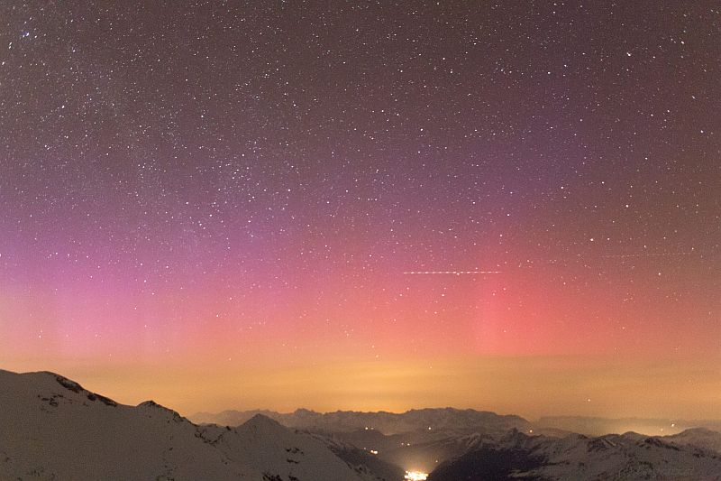 Am Funtensee bei Berchtesgaden sieht man um 21:00-21:20 und 23:50-00:30 trotz viel Licht von unten eine Rotfärbung des Himmels: