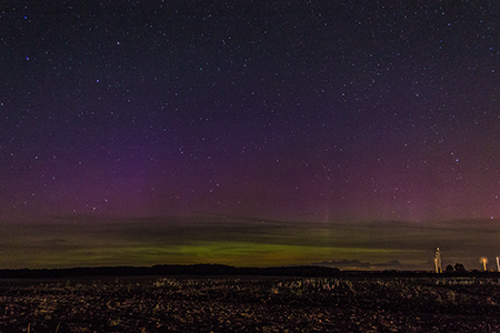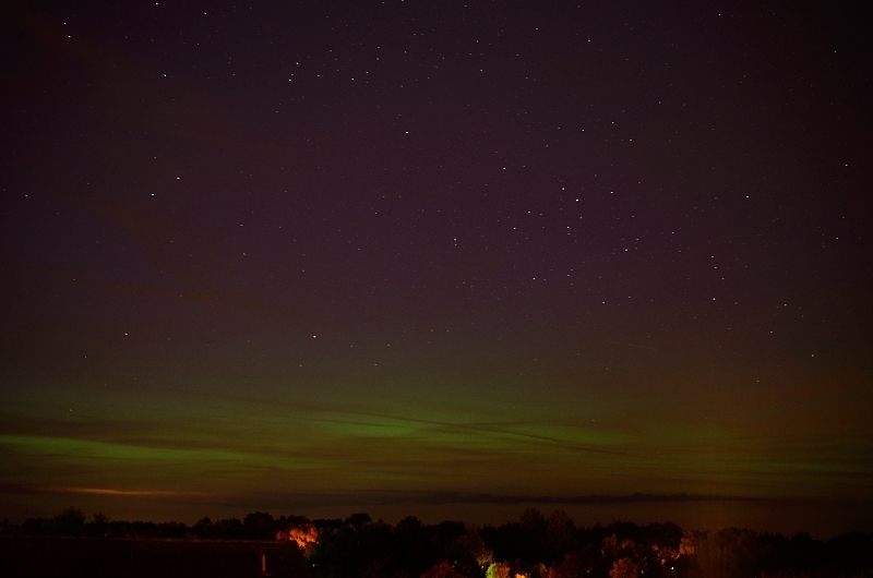Soeben auch in Borken fotografisches Polarlicht. Grün am Horizont, darüber violett mit Strahlen für einen kurzen Moment. Dicht am Horizont.