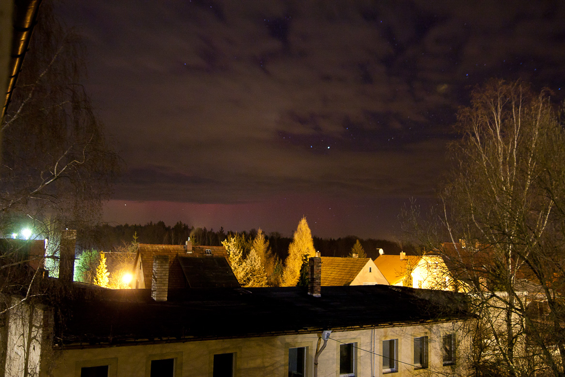 Auch ich gehöre zu den Wolkengeplagten, aber muss wohl schon froh sein, überhaupt etwas gesehen zu haben, schließlich hatte das Satellitenbild einen weiträumig bedeckten Himmel mitgeteilt. So hat es sich aber ausgezahlt, dass ich auch mal aus dem offenen Fenster geschaut habe und die hellsten Sterne sehen konnte. Ein paar Testbilder um kurz vor 21 Uhr aus dem Fenster ließen mich dann schwach Polarlicht erkennen, und das bei Belichtungszeiten, die deutlich unter dem liegen, was ich sonst gewöhnt bin.