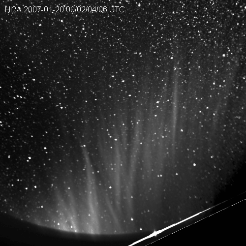 Könnte es sein, dass uns da der Kometenschweif auf wunderbare Weise vorführt, wie ungleichmäßig der Sonnenwind ist? Will heißen: in Zeiten, bei denen der Sonnenwind stärker ist, wird auch mehr Material vom Kometen abgetragen, was sich später in einer Art Strahl (intensiverer Schweifrückstand) erkennen läßt.
