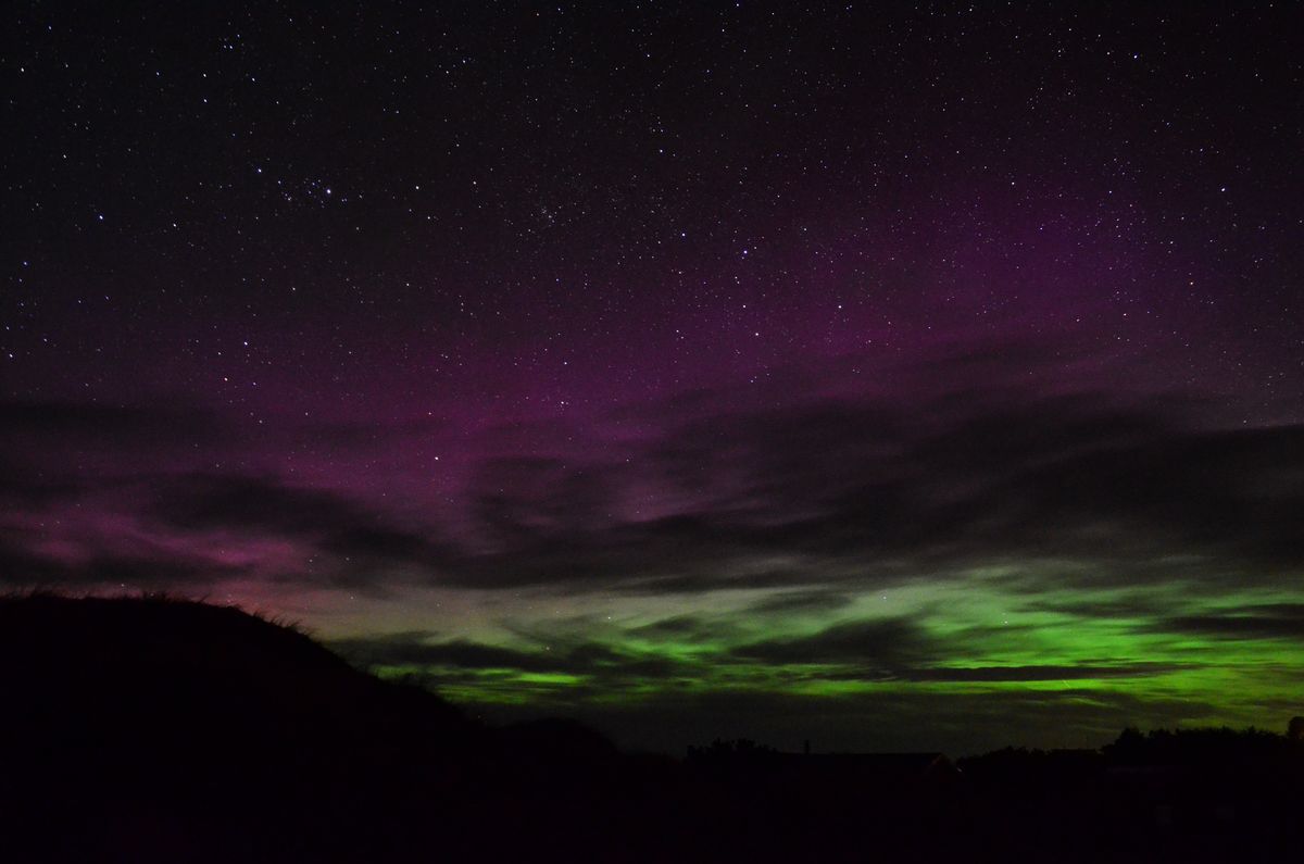 In Oldenburg gab es kurz vor 23 Uhr MEZ visuell deutlich sichtbares Polarlicht, grüner Bogen mit violetten Beamern darüber.