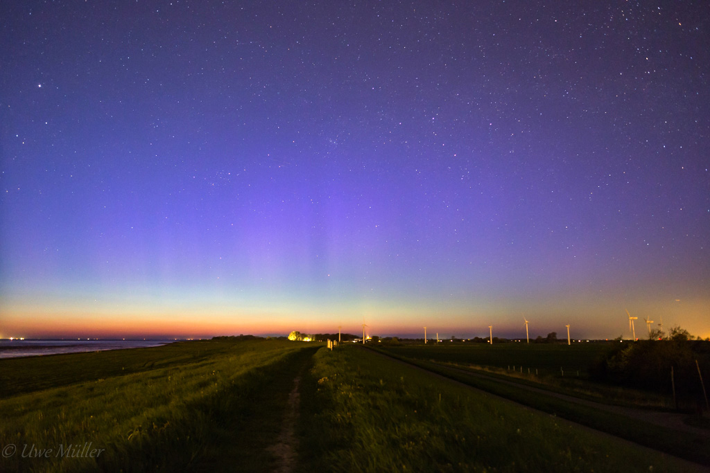 Ich war gegen 23 Uhr am Bülker Leuchtturm, wo ich wieder Carsten und auch zwei neugierige Polarlicht-Jungfrauen traf und wie vor einer Woche hatte ich gleich auf meinen ersten Bildern schöne Strahlen in der Dämmerung (die hier nun schon bis 00:44 MESZ reichte!). Eigentlich wollte ich nur die Milchstraße nochmal ablichten, bevor es demnächst keine dunklen Nächte mehr gibt, und da gab es nun eben ein schönes Extra dazu. :)