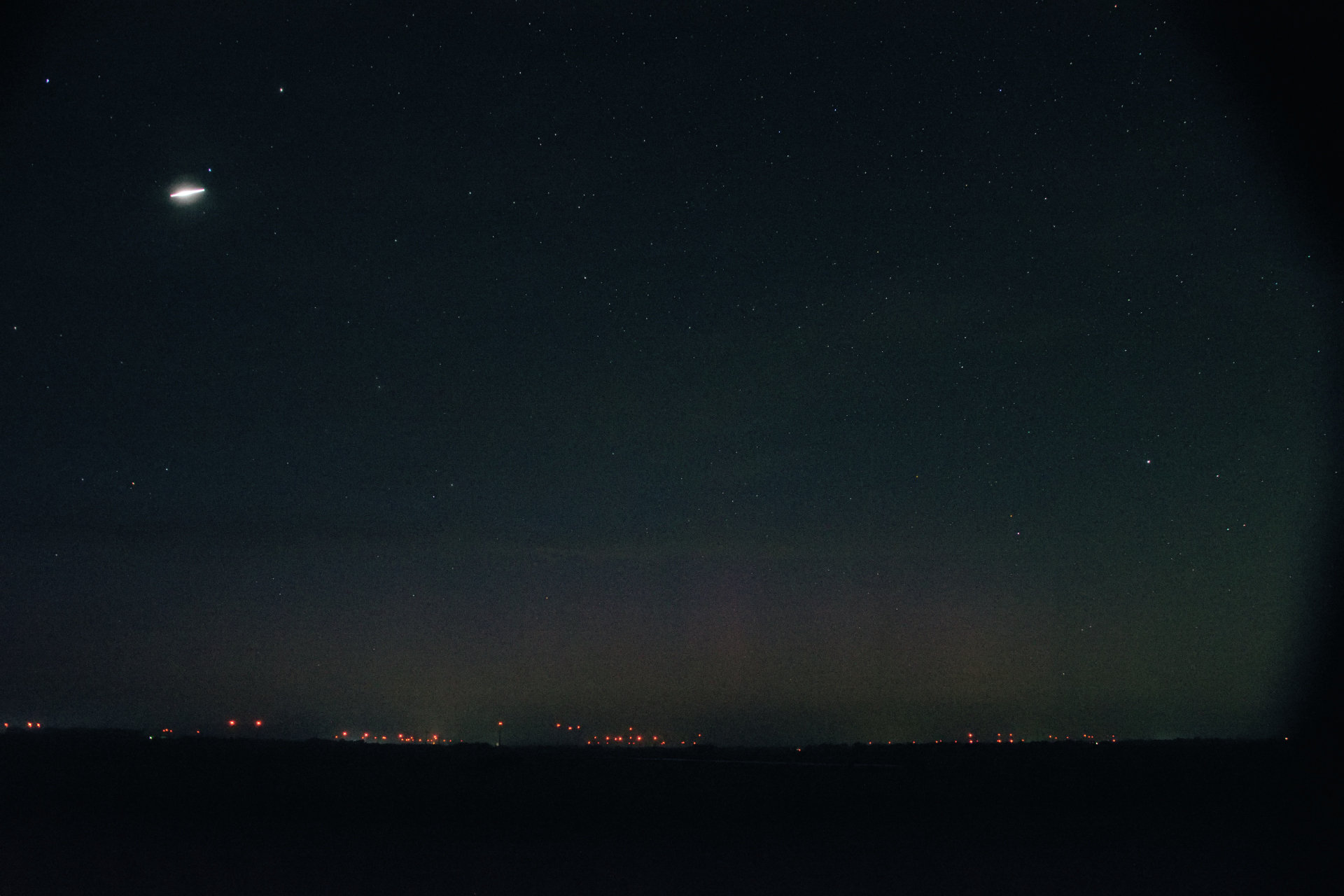 Es gab zuerst einen kurzen "Ausbruch" schwachen roten Polarlichts mit noch schwächeren hochreichenden blauen Strahlen, später auch etwas Grün aber eher nur ein Hauch ist und wohl größtenteils vom Dunst geschluckt. Eventuell auch ein Protonenbogen auf ein paar Bildern.. Aber könnte auch nur danach aussehen.