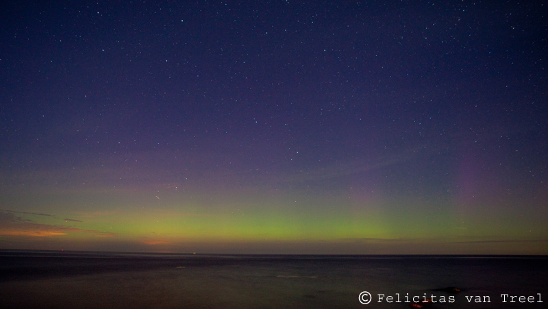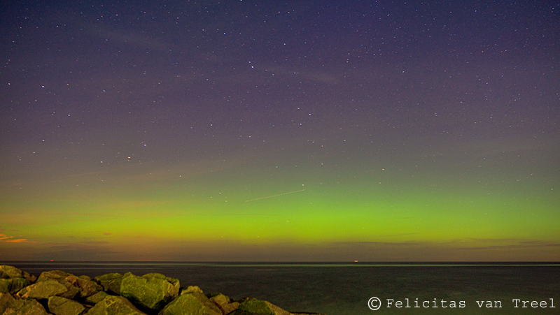 in der Ostsee war. Zufällig habe ich an dem Abend das Polarlicht entdeckt. Ich war gerade mit einer Freundin am telefonieren und schwärmte von dem tollen Mondaufgang der Orangefarbig über dem Meer aufging. Kurze Zeit später entdeckte ich es zufällig am nördlichen Himmel, direkt über der Ostsee.