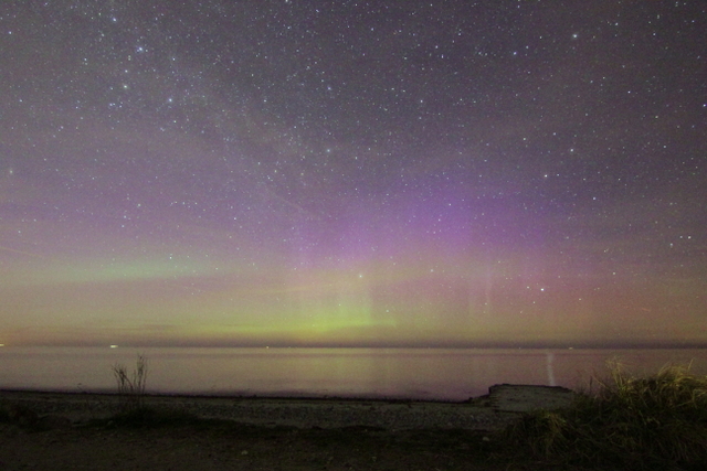 Hier ist noch ein Bild von 3:27 MESZ, als nochmals schwach visuell sichtbare Strahlen über den Horizont zogen. Ich konnte sie mit bloßem Auge bis fast zur Cassiopeia erkennen, also sogar den blauen Teil (Farben nahm ich keine wahr). Kurz danach war dann bei meiner Heizung die Batterie leer und als die Linse dann irgendwann beschlug, packte ich ein. Das Wetter war wohl mal wieder der entscheidende Faktor, es war ja sehr dunstig, neblig und feucht. Ich hab mich deshalb für Fehmarn entschieden, weil dort extrem wenig Lichtverschmutzung stört - und im Dunst gestreut werden kann.