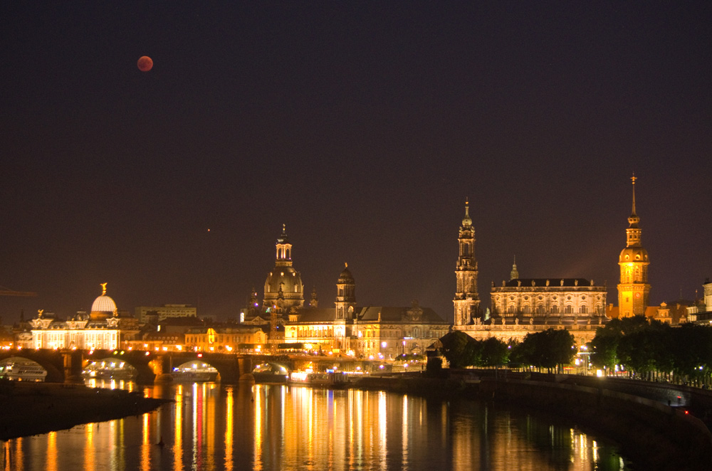 Massenauflauf auf der Brücke, das blieb so von meiner Ankunft zur Mondaufgangszeit bis zum Ende der Totalität; Autos hielten mit Warnblinker an, das Partyvolk quetsche sich an den Fotografen vorbei, Straßenbahn und richtige Bahn machten "schöne" Geräuschkulissen, ein paar Böller und Bengalos kamen auch noch dazu (Dresden halt...), 22:36 MESZ: