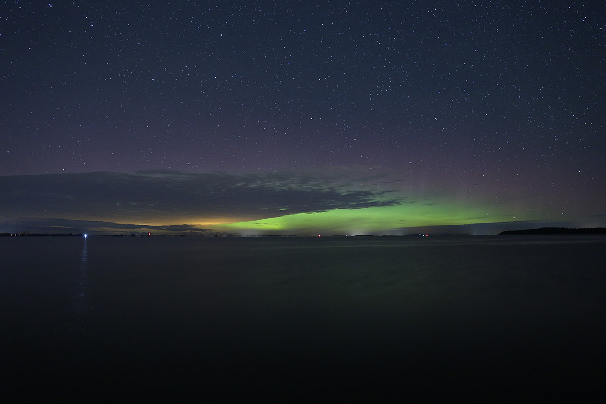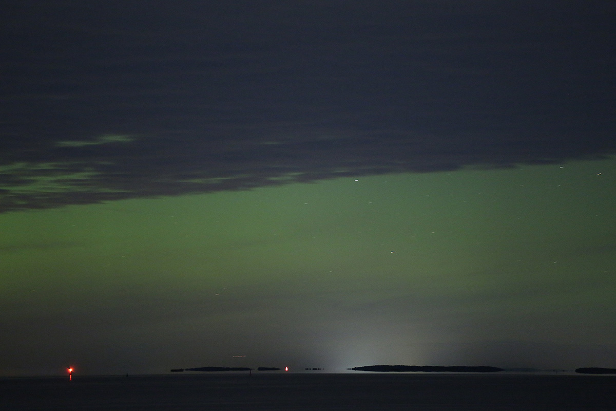 Das Nordlicht war visuell nicht nur als Aufhellung sichtbar, sondern leuchtete auch deutlich grün, den in den Fotos ebenfalls sichtbaren rote Anteil oberhalb der Wolken konnte ich aber mit bloßem Auge nicht wahrnehmen.