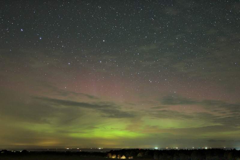 Rechtzeitig zum einsetzenden Substorm von ca. 22:00-22:20 MESZ - von meiner Warte aus "schwach visuell" - riss es etwas mehr auf (Beispielbild siehe unten). Ab 22:30 MESZ zog es wieder stärker zu, gegen 23:00 MESZ habe ich die Beobachtung beendet.