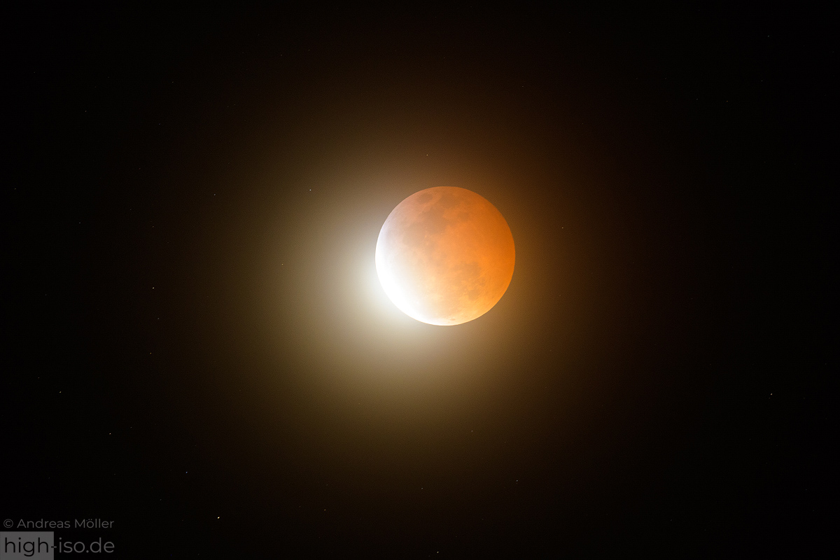 vorigen im letzten Juli. Die jetzige Mondfinsternis war allerdings viel besser zu beobachten, weil Hoch Brigida quer über Deutschland lag und alle Wolken in der Region vertrieben hat. Nur die Lichtverschmutzung von den belgischen Autobahnbeleuchtungen konnte einem noch in die Suppe spucken. Die Beobachtung war diesmal allerdings eine Prüfung für Mensch und Ausrüstung, denn an meinem Beobachtungsort bei Kalterherberg war es -13 °C kalt. Für die Fotos ist die Kälte sogar besser, denn durch die natürliche Kühlung arbeitet der Bildsensor etwas rauschärmer.