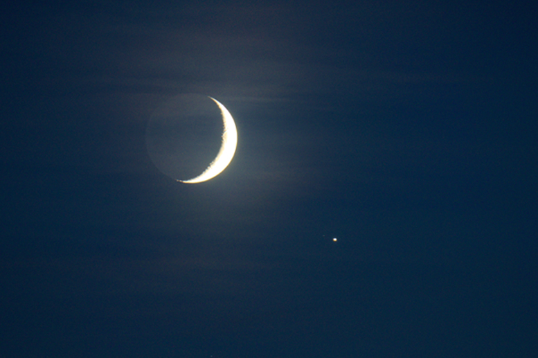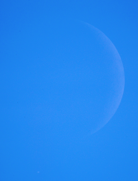 Ich hatte es auf den Jupiter abgesehen, deswegen ist die Aufnahme für die Mondsichel natürlich viel zu hell abgelichtet worden. Aber, ein Mond des Jupiters konnte ich dafür erwischen - trotz Dunst