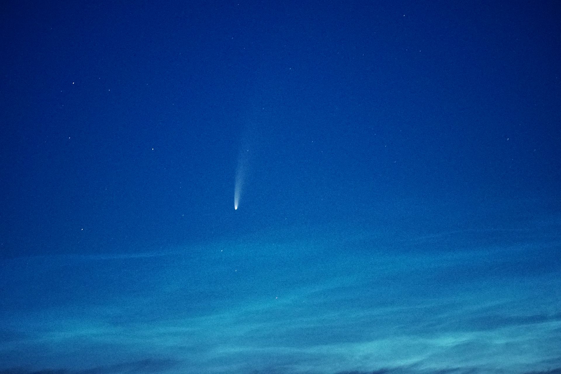 Ich war gestern Abend wegen des endlich mal guten Wetters nach Gallin in MV gefahren, weil mir dort die Gefahr durchziehender Wolken geringer schien als nördlich von Hamburg. Hat gut geklappt. Der Nordhorizont war die ganze Nacht wolkenfrei. NEOWISE ware einfach fantastisch, auch mit bloßem Auge - gerade auch wegen der NLC der Helligkeit 3-4. Die hielten sich bei dem Sonnenstand nur unterhalb des Kometen auf.