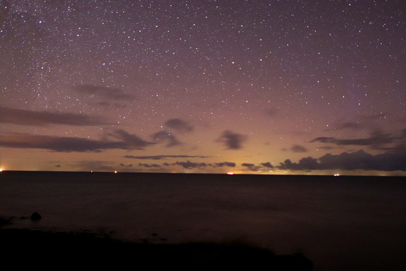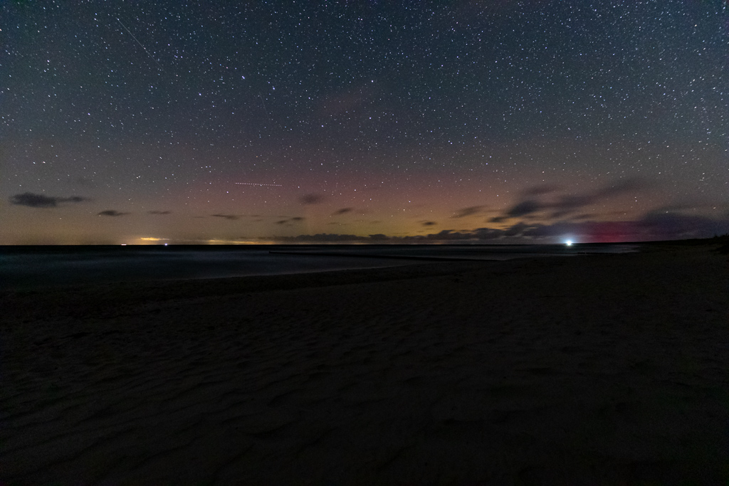 Ich glaube ich hatte heute Abend (11.10) am Strand von Ahrenshoop auch Glück. Um kurz nach 22:00 lockerten sich die Wolken im Norden und ein leichtes fotografisches Polarlicht kam zum Vorschein. Die helle Lichtquelle ist der Leuchtturm Darßer Ort.