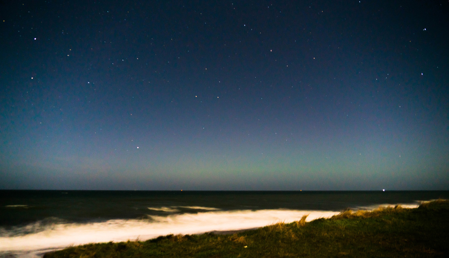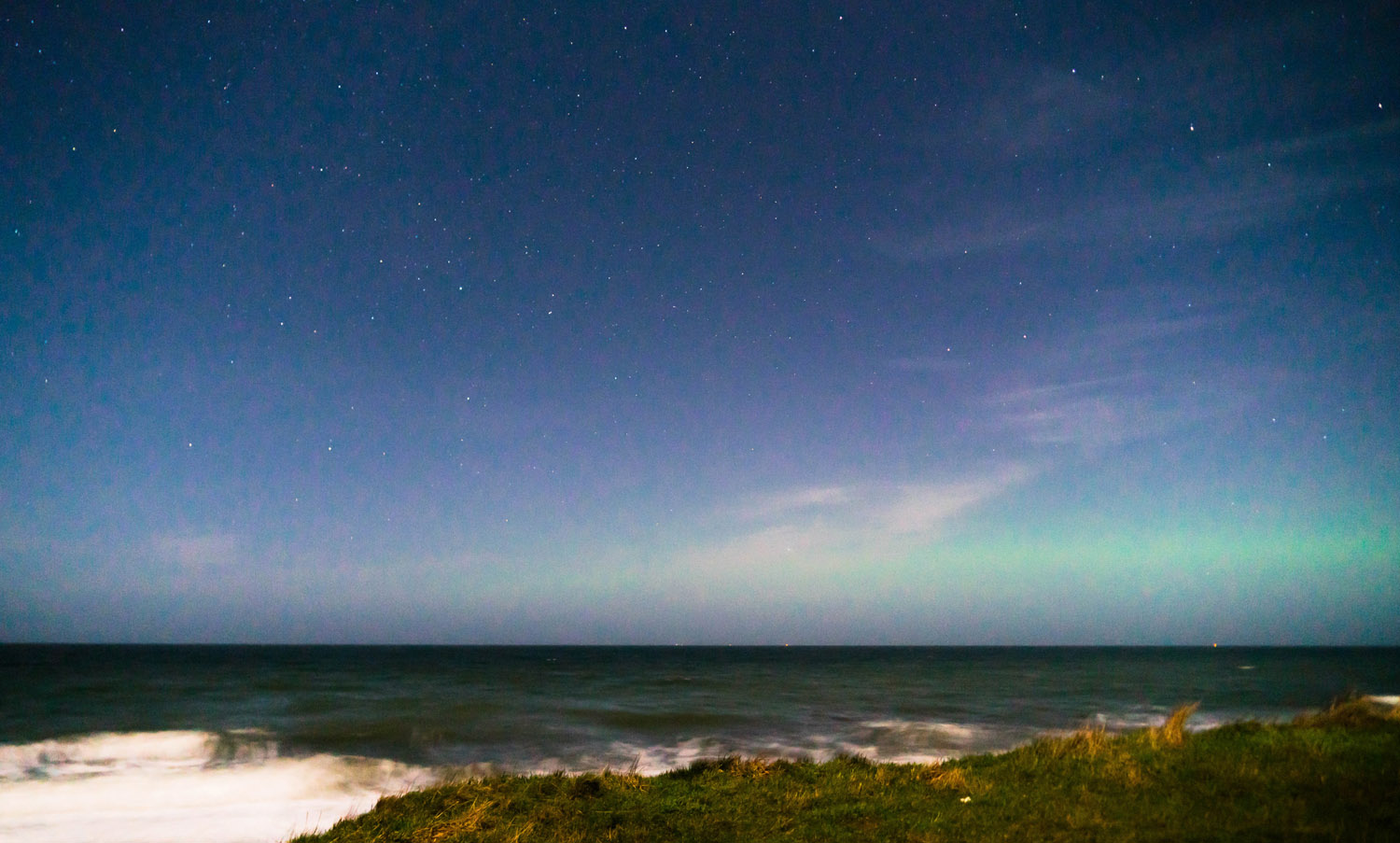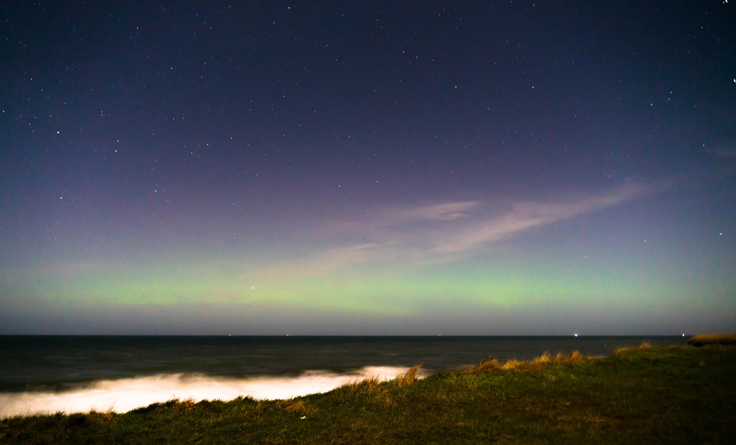 Noch meine "Nachmeldung" von Freitagabend: Leider haben wir erst gegen 23 Uhr aufs Handy geguckt und die Meldungen gesehen. Nichts wie an die Förde, vorher noch an die einzige 24-Stunden-Tanke in der Ecke (mit der üblichen Freitgabend-Schlange...). Gegen 23.50 waren wir endlich am Wasser und konnten gleich schön den grünlichen Bogen erkennen. Nach ein paar schnellen Fotos sind wir ein paar 100m weiter gefahren und gegangen, zu einem dunkleren Strandabschnitt. Auf dem Weg bemerkten wir dann deutlich visuell die Beamer und den rötlichen Schimmer am östlichen Ende gegen Mitternacht.