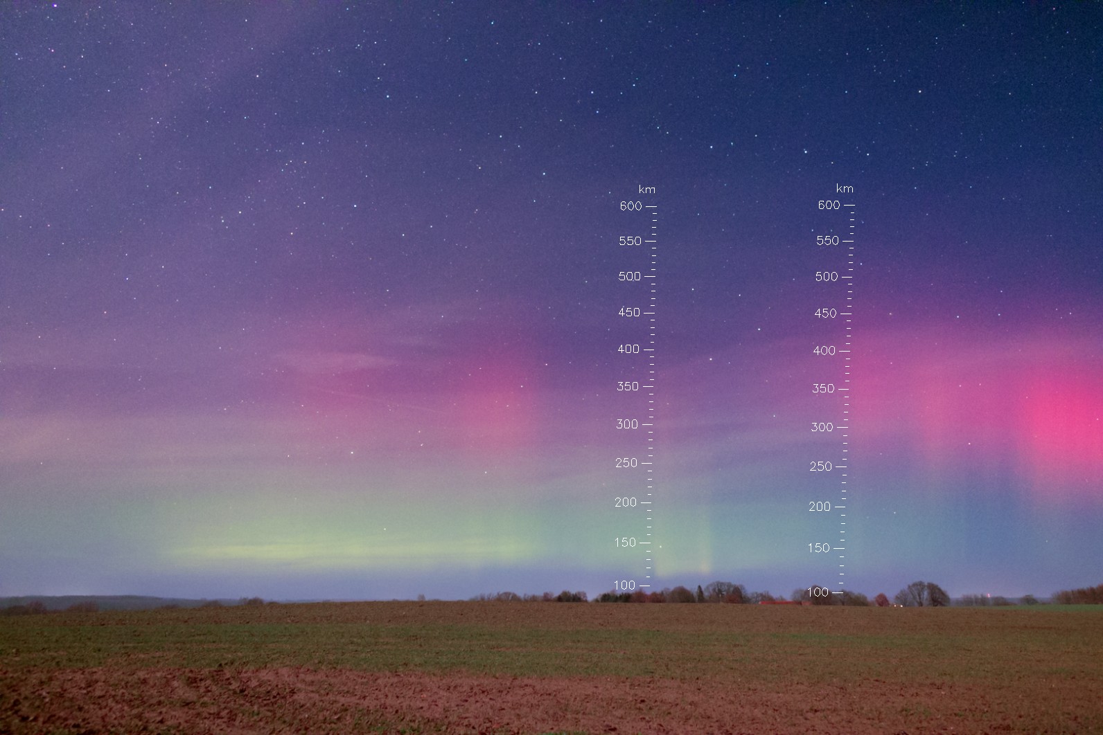 Passt alles zur Theorie. Die Unterkante des grünen Bogens lag in etwa 115 km Höhe. Oberhalb 200 km findet der Übergang zum rotem Polarlicht statt, was mit der immer weiter abnehmenden Luftdichte zu tun hat.