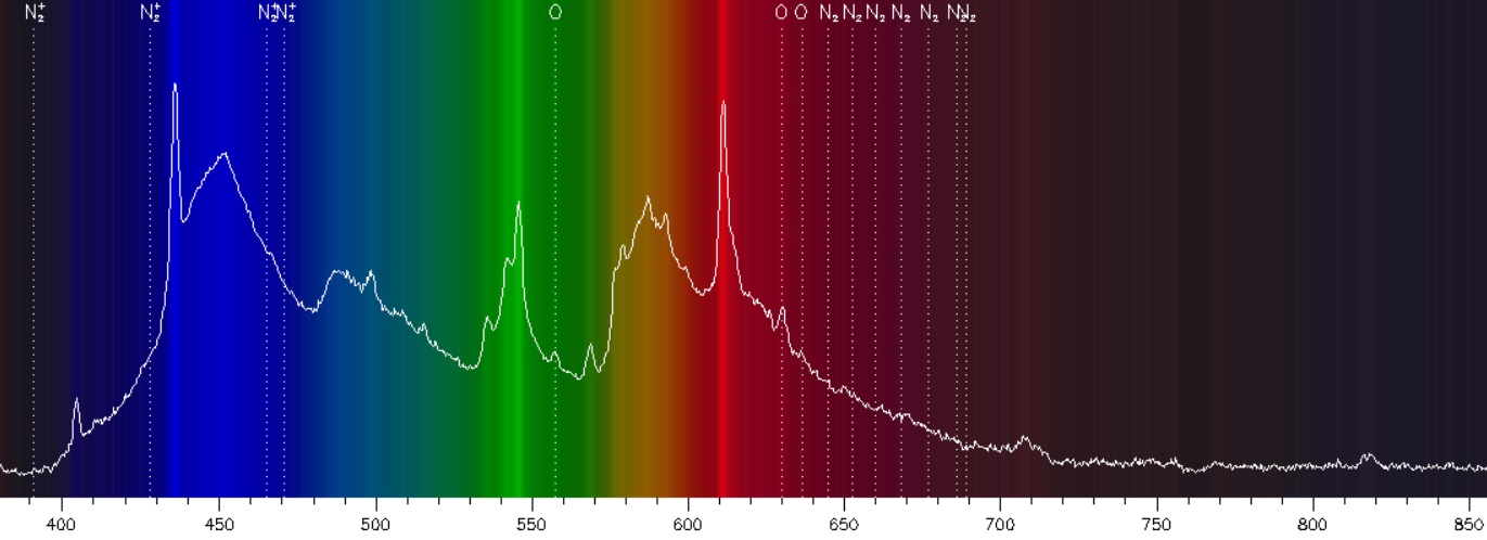 In diesem Diagramm ist die Lage der Linien, bei denen Polarlicht leuchtet, eingetragen. Die vom Spektrografen gemessene Emission bei 630 nm stammt in dem Fall nicht von PL sondern von der Stadtbeleuchtung. Irgendein Lampentyp hat ziemlich genau bei 630 nm eine Emissionslinie, exakt wo auch das rote Polarlicht leuchten würde...