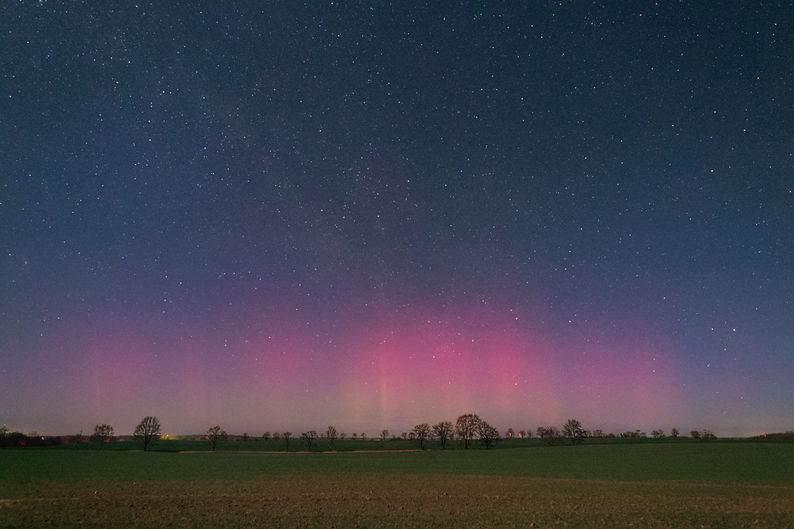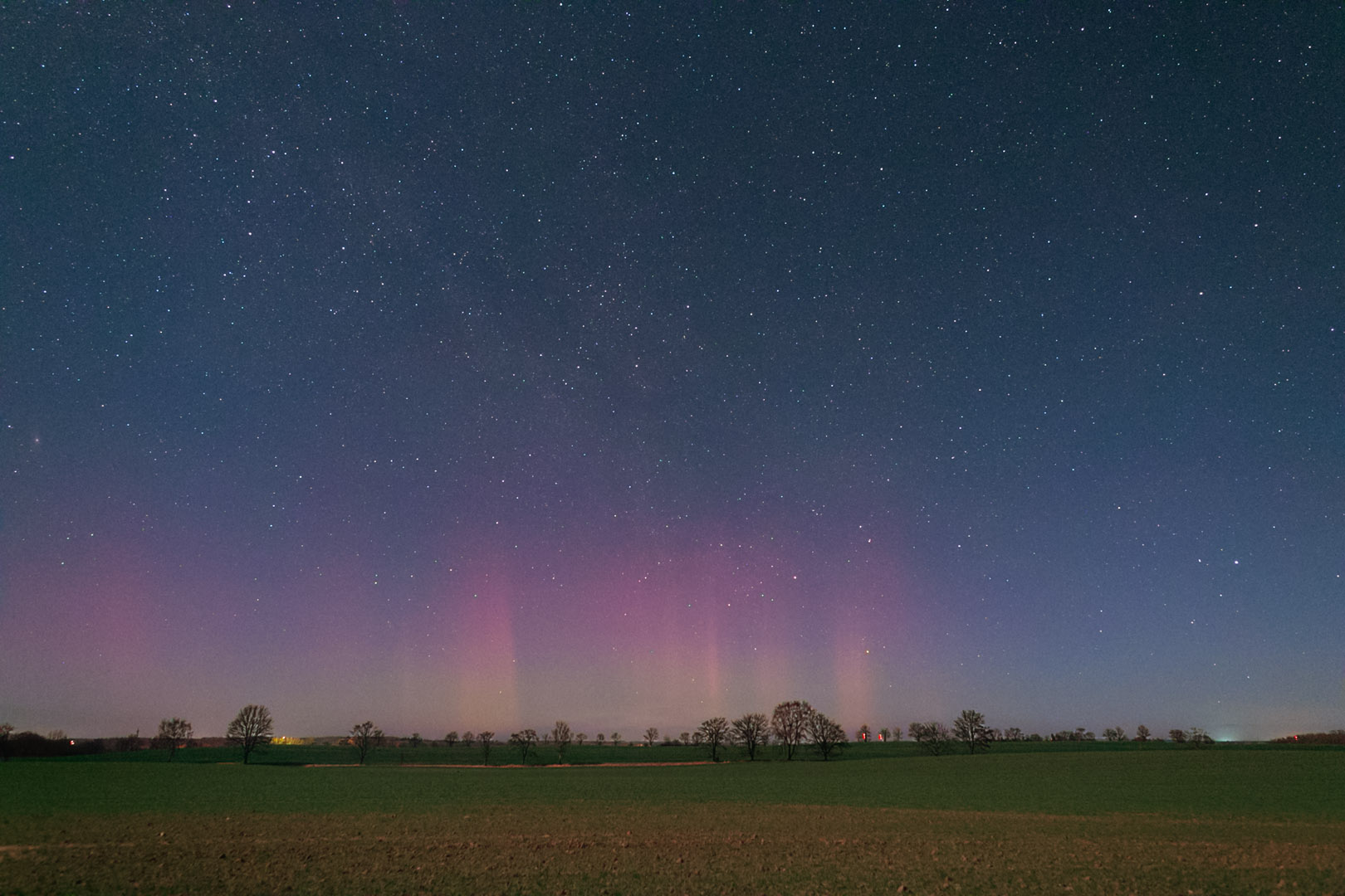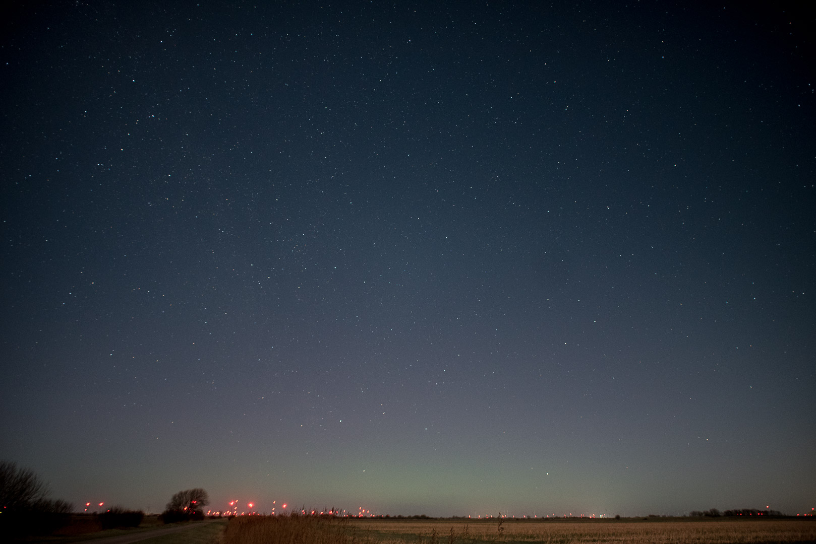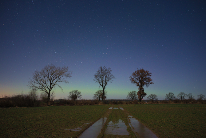 Also fuhr ich wieder los zu einem Feld etwas nördlich von Bremerhaven. Während visuell nichts auszumachen war (der helle Halbmond hatte auch seinen Anteil daran)...konnte ich fotografisch tatsächlich einen grünen Bogen ausmachen sowie dahinter einen blassen magentafarbenen Schimmer.