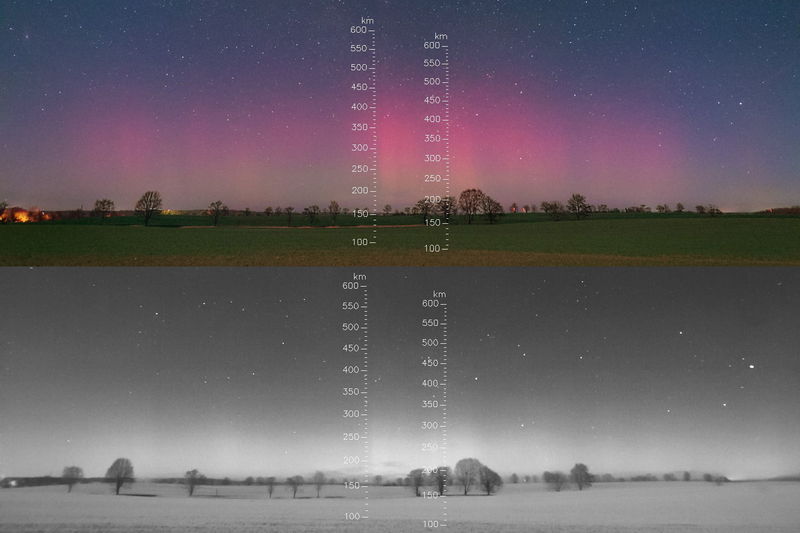 Es fällt auch ohne die eingeblendeten Höhen auf, dass das IR-Polarlicht nicht so hoch reicht, wie das rote Polarlicht (630 nm), das auf O+-Ionen zurückgeht. Grund ist vermutlich, dass mit zunehmender Höhe immer weniger neutrale Sauerstoffatome vorhanden sind. Denn weiter oben werden wohl die meisten Atome/Moleküle durch Sonnenwind und allgemein Strahlung aus dem All ionisiert. Heißt ja nicht um sonst Ionosphäre da oben