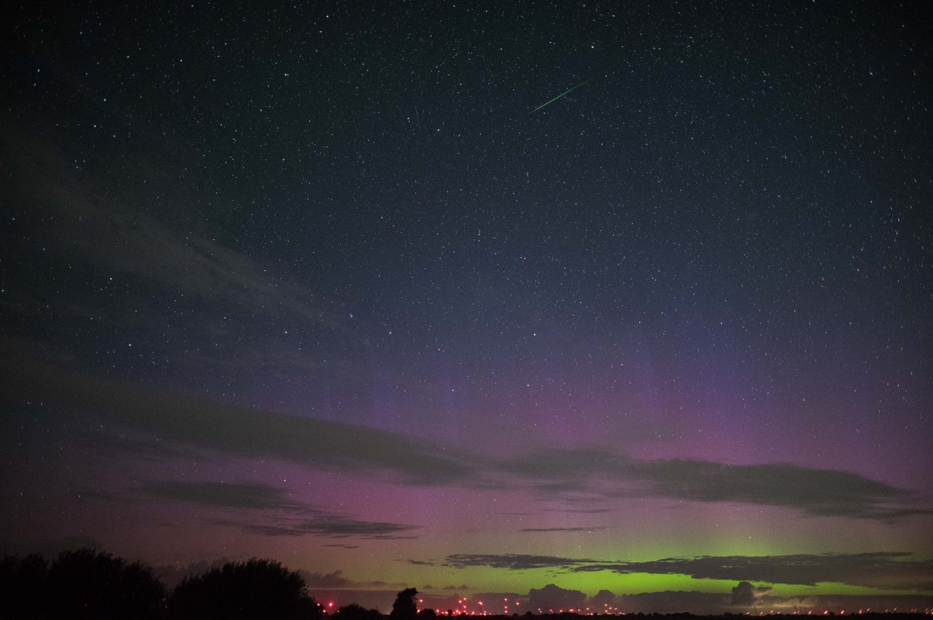 Erscheinungsbild: Zeitweise Beamer, sowie rot-violettes Hintergrundglühen und ansatzweise grüner Polarlichtbogen