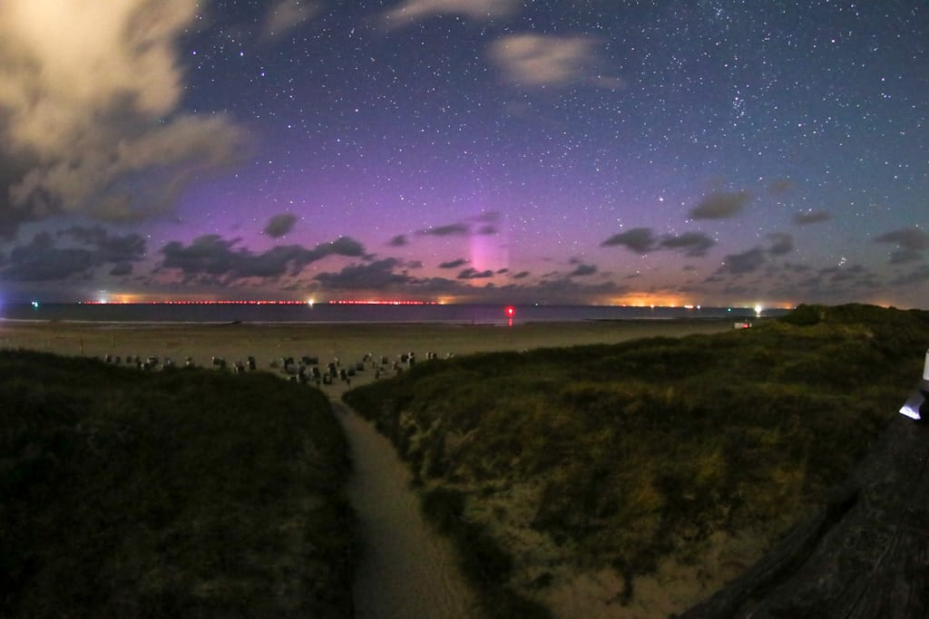 etwas spät auch noch mein Beitrag zu dieser Polarlicht-Nacht. Von Norderney aus waren sie über der Nordsee gut zu sehen. Angefangen hat es mit einem einzelnen kräftigen Beamer, der "auf einmal da war" und nach kurzer Zeit wieder verschwand. In der Folge zog ein Wolkenfeld durch und als der Himmel wieder frei war, konnte man etwa 1-1½ Stunden lang eine leichte Dauerbescheinung des Nordhimmels sehen. Als ob auf dem Horizont (hinter dem Wolkenband) eine Leuchtröhre gewesen wäre. Es gab einige Beamer und auch deren Bewegung nach rechts war anhand der Hintergrundsterne gut zu sehen. Manche Beamer erschienen binnen Sekunden und verflüssigten sich innerhalb weniger Minuten wieder. Die Polarlichter erschienen überwiegend einfach als helles farbloses Licht. Am Anfang war ein leichter rötlicher Farbstich im Großen Bären zu sehen (der sich mit den Bildern auch gut verifizieren lässt), meine Mitbeobachterin konnte sogar kurzzeitig das helle grün am Ende als grün erkennen. Für mich war das nur ein heller farbloser Fleck. Dieser Fleck hebte sich in puncto Helligkeit noch einmal deutlich vom "Grundleuchten" ab. Kurz darauf zogen endgültig Wolken auf und versperrten die weitere Beobachtung.
