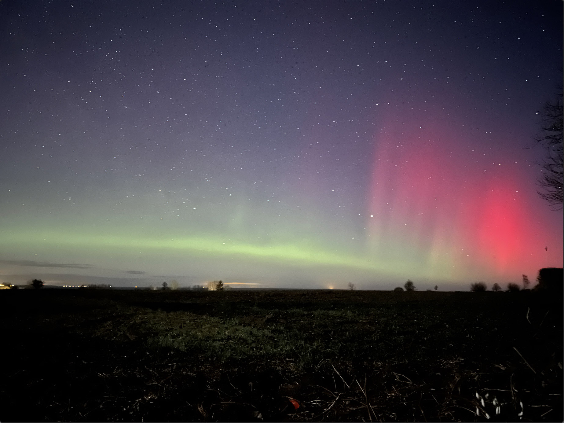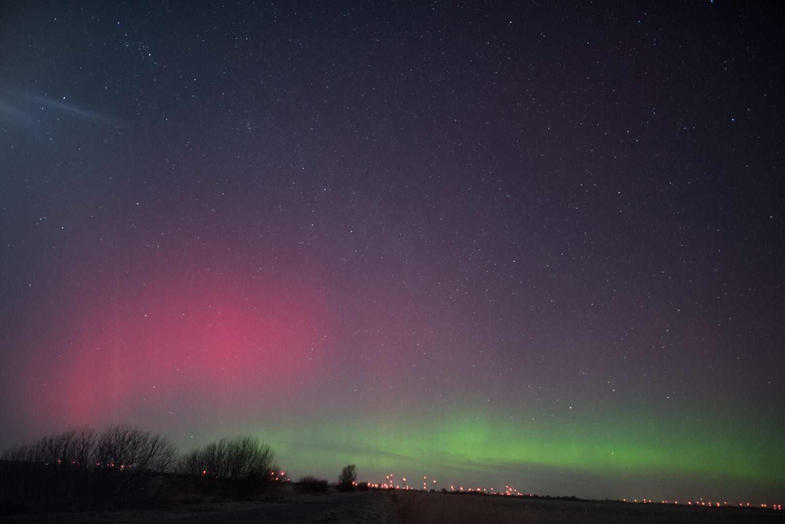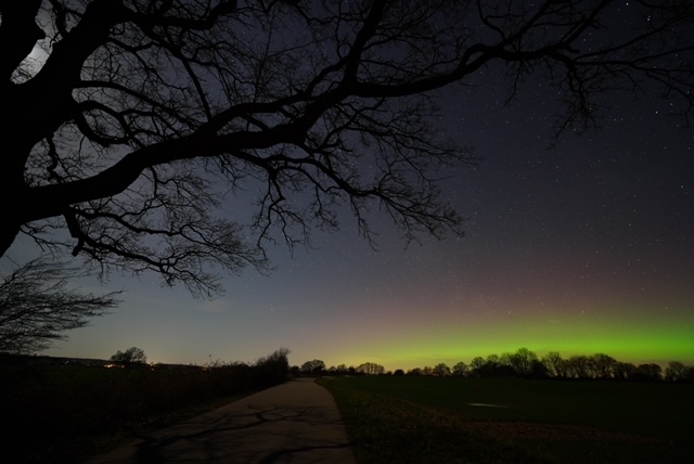 Doch obwohl da ja schon vor dem LD-Flare von gestern eine nennenswerte CME zu uns herübergespuckt wurde, hatte ich das nicht wirklich auf dem Schirm gehabt und war freudig überrascht, als sie am Abend eintraf. Als ich die erste Kamera startklar hatte, dauerte es nicht lange bis schon ein schöner, grüner Bogen über dem Nordhorizont emporwuchs, aber was danach noch kam kann sich zu den besten Polarlichtsichtungen gesellen, die ich in meinen bescheidenen 10 Jahren Beobachtungszeit machen durfte.