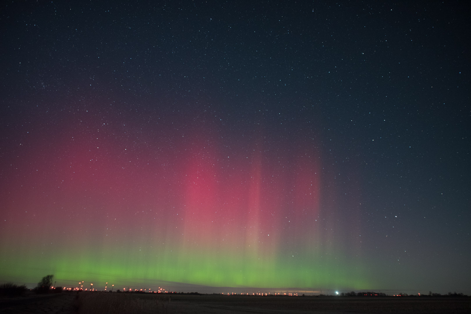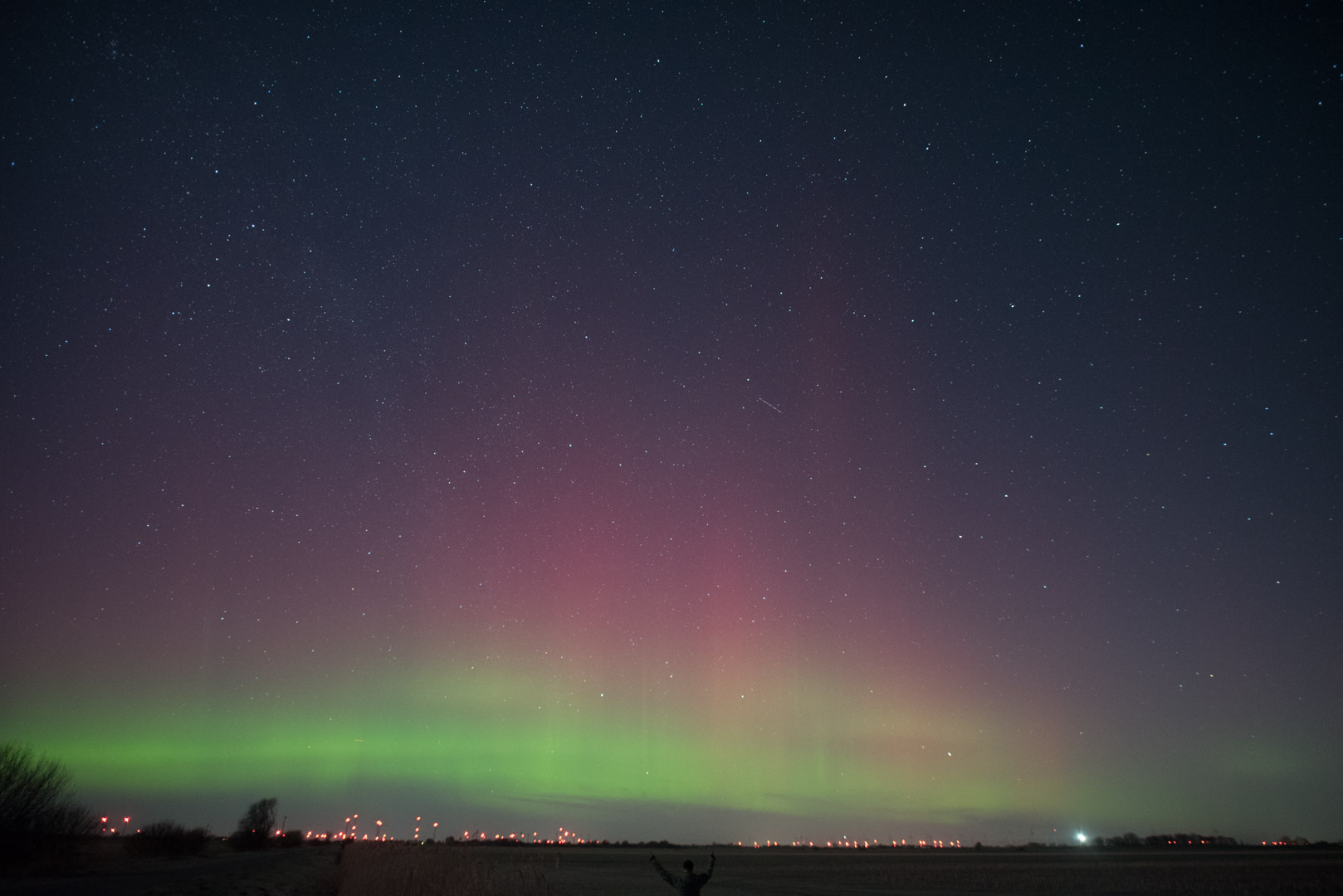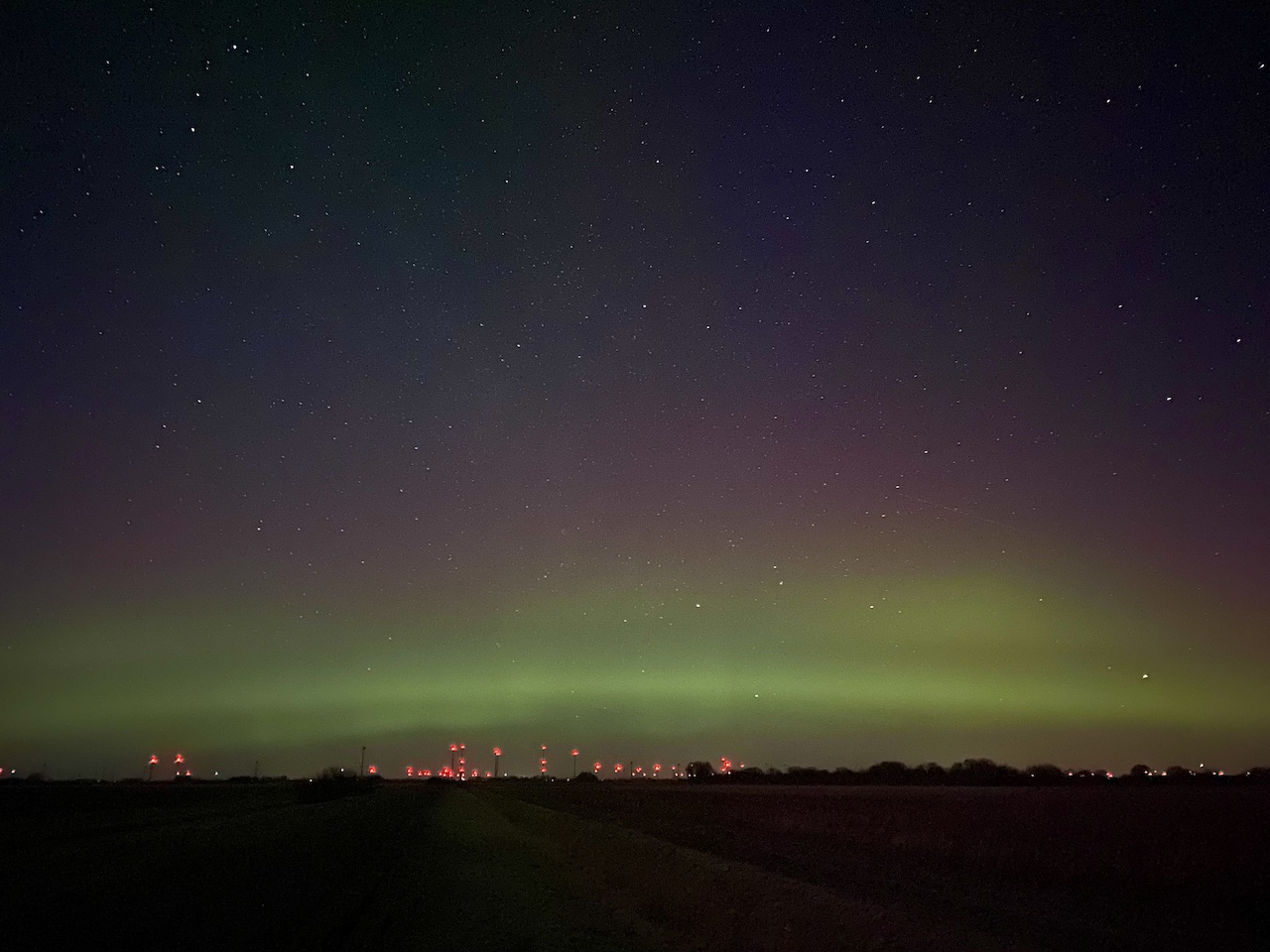 Doch obwohl da ja schon vor dem LD-Flare von gestern eine nennenswerte CME zu uns herübergespuckt wurde, hatte ich das nicht wirklich auf dem Schirm gehabt und war freudig überrascht, als sie am Abend eintraf. Als ich die erste Kamera startklar hatte, dauerte es nicht lange bis schon ein schöner, grüner Bogen über dem Nordhorizont emporwuchs, aber was danach noch kam kann sich zu den besten Polarlichtsichtungen gesellen, die ich in meinen bescheidenen 10 Jahren Beobachtungszeit machen durfte.