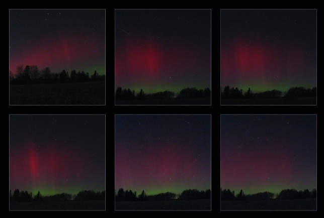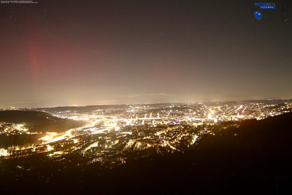 Kommentar: Zunächst deutlich visueller grüner Bogen mit zunehmenden teils schnell wandernden Strahlen, kurz nach 21 Uhr UTC erster und hellster Substurm mit visuellem Grün und schwachem, diffusen Rot darüber sowie teils hochreichenden hellen Strahlen. Zwei weitere Substürme etwas geringerer Intensität bis etwa 0 UTC mit grünen und roten Strahlenvorhängen und markanten Einzelstrahlen.