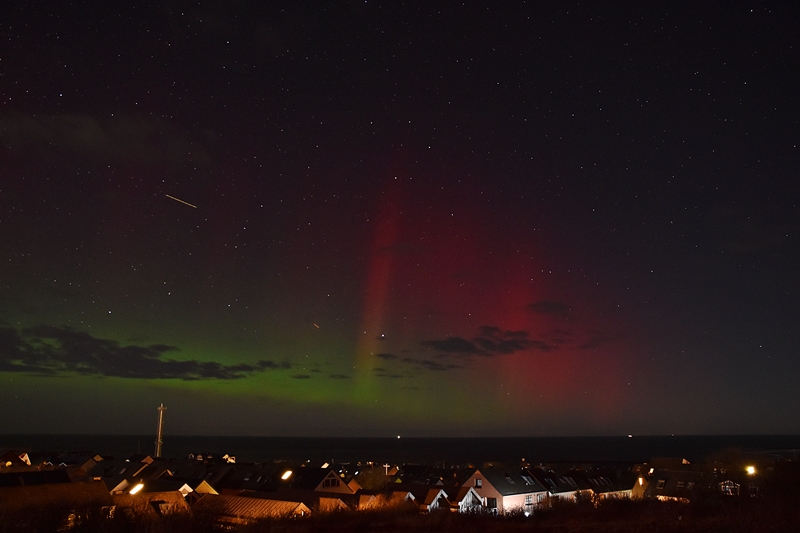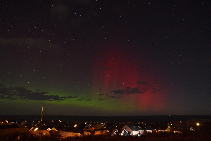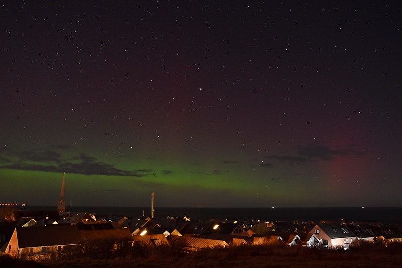 Während der hellsten Phase kurz nach 21h UTC waren sowohl der Bogen mit einzeln erkennbaren, teils schnell wandernden Strahlen, als auch die meist wesentlich schlechter erkennbaren roten Vorhänge darüber schwach in Farbe sichtbar. Da kann ich mich nur an 3-4 andere Sichtungen ähnlicher Qualität aus 2014-2015 erinnern. Angesicht der ordentlichen Lichtverschmutzung hier plus Mond dürfte das mindestens an der Schwelle zu hellem Polarlicht gewesen sein. Einen Vergleich zum März letzten Jahres kann ich nicht ziehen, da ich da die hellste Phase knapp verpennt hatte.