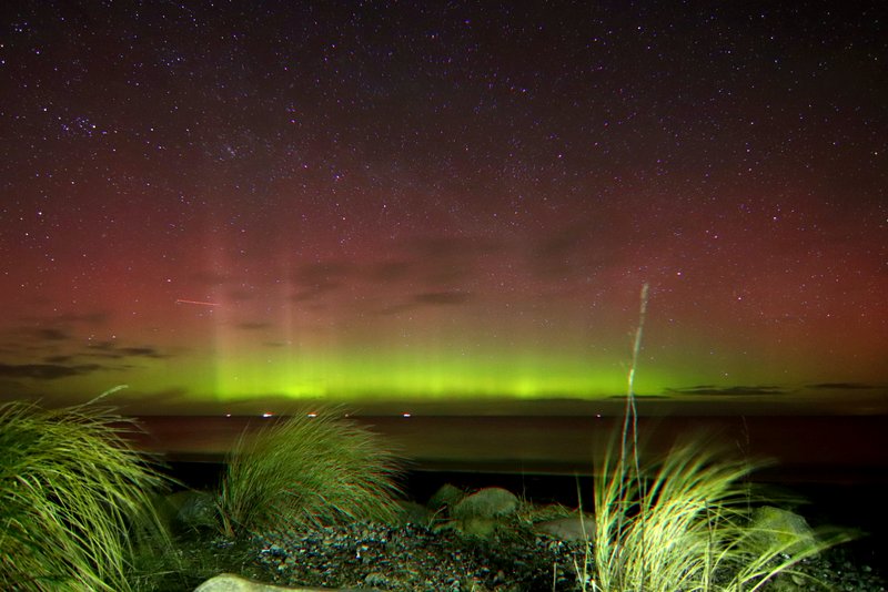 Kommentar: rotes diffuses Polarlicht schwach visuell; grüner gleichmäßiger Bogen später deutlich visuell, helle Strahlen deutlich visuell bis in eine Höhe von 25° - 30°