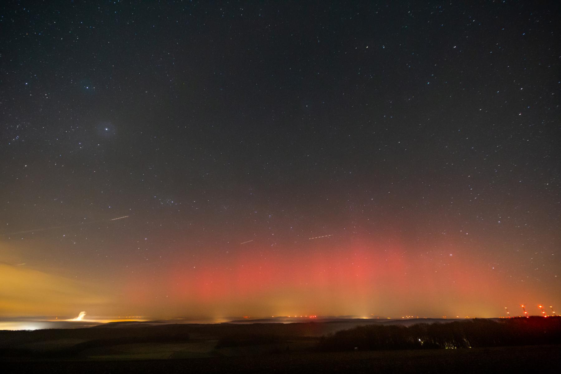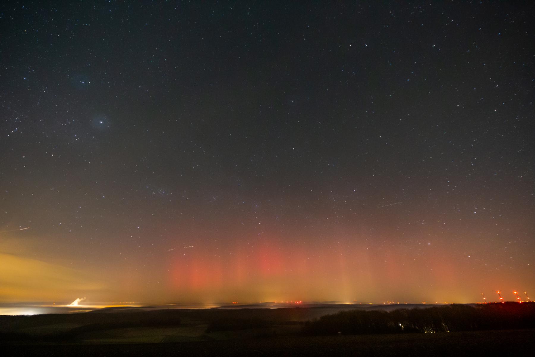 Erscheinungsbild: Fotografisches rotes Polarlicht und bis min. 23:30 (MEZ) langsam gen NNO wandernde Beamer. Später (fotografisch dokumentiert) hochreichendes, rotes Polarlicht mit Beamern, horizontnah darunter diffuses grünes Polarlicht.