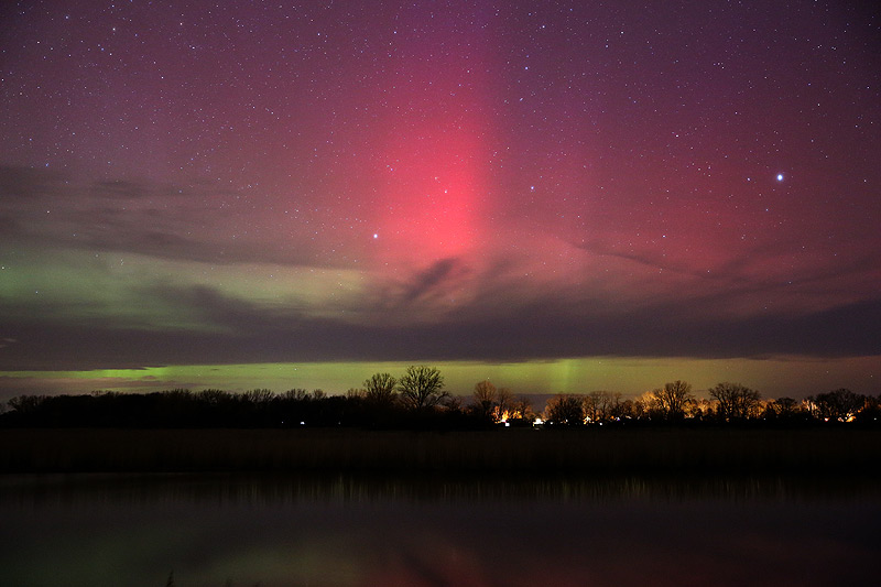 Letzte Nacht in Greifswald am Flüsschen Ryck bei Greifswald: Wunderschönes visuell sichtbares Polarlicht und plötzlich stand eine helle weiße Lichtsäule in der Landschaft, für etwa 30 Sekunden. Ich hatte das gleiche Phänomen schon Ende Februar beobachtet, hatte aber damals gerade die Position gewechselt und konnte es nicht mehr fotografieren. Diesmal habe ich mehr Glück.