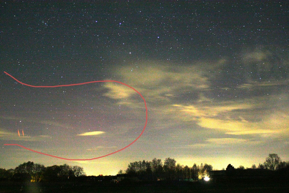 Ab Aufzeichnungsbeginn 19:38 UT PL grün, schwach, unter Wolken (Horizont), ggf. etwas rot (obwohl dies meist Lichtverschmutzung ist).