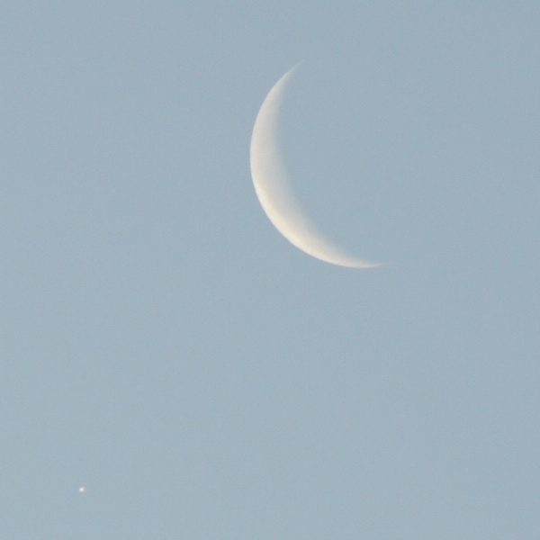 07:40–07:55 Jupiter etwa 3–4x erhascht; etwas überraschend, da der Himmel nicht so klar und milchig-weiß statt satt-blau war. Jupiter etwa 1 Mond-Dm unterhalb und 2/3 rechts vom Mond
