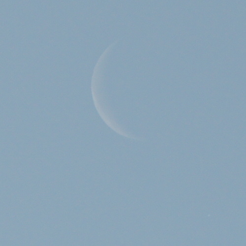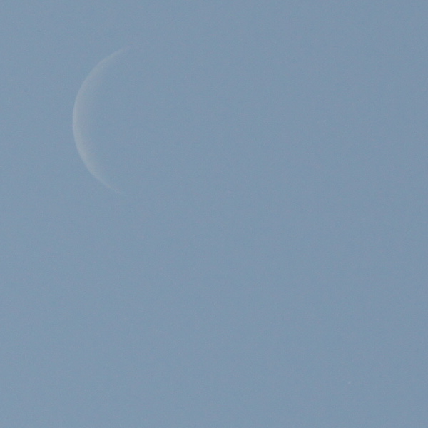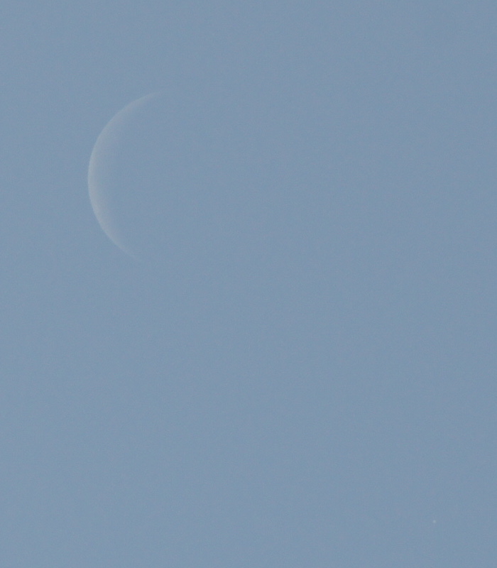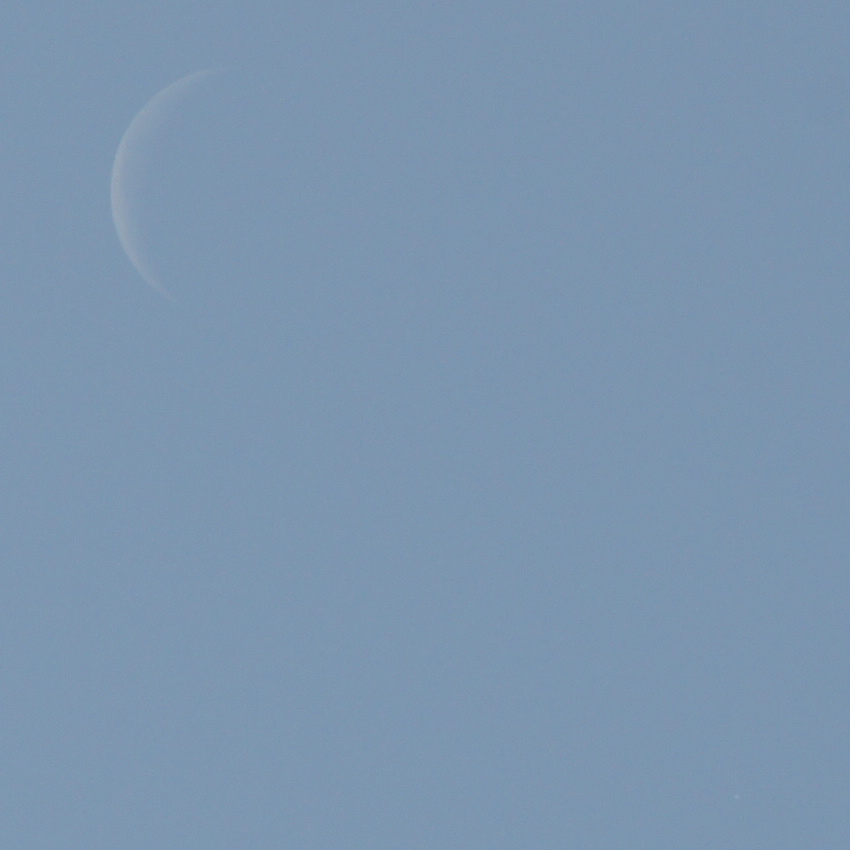 10:15 Mond und Jupiter im Meridian – letzter Versuch: nur noch unsichere Sichtungen, da sich die Schätzung des Abstandes von der Mondsichel äußerst schwer gestaltete, ja eigentlich unmöglich war. Es fehlten wohl feine Cirren, die Orientierung geboten hätten...