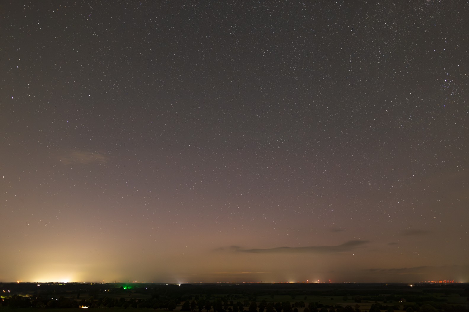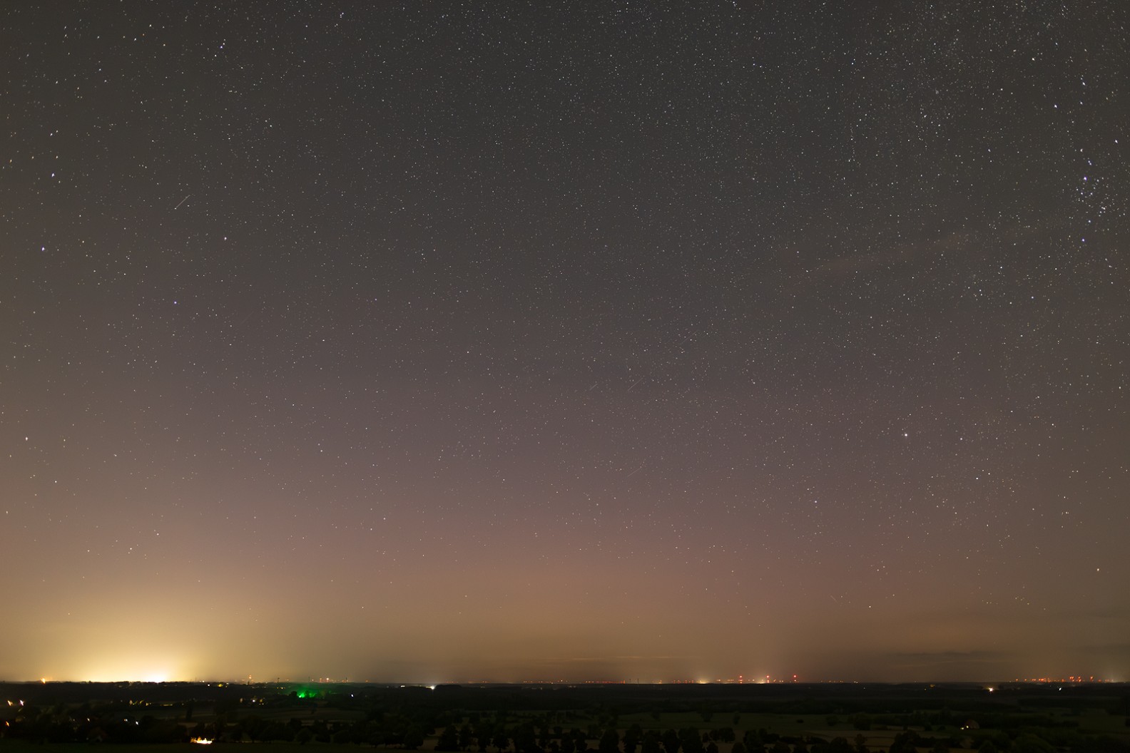 Derzeit fotografisches Polarlicht bei Lübbecke. Ganz aktuell zunehmende Aktivität, ein lila Glühen (bis auf Höhe 20 Grad+) mit wandernden Beamern bis in schätzungsweise 20 Grad Höhe.