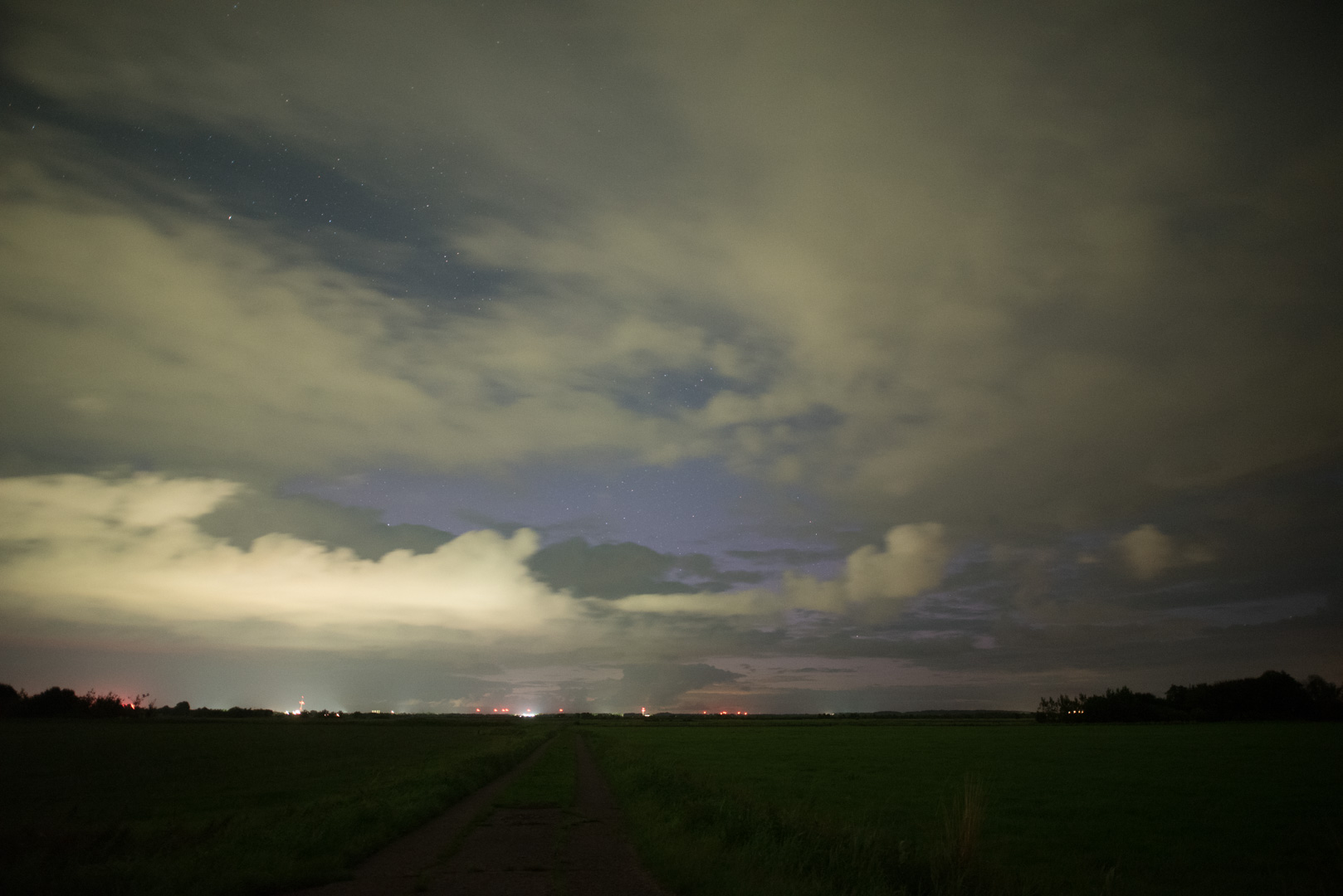 Schlussendlich konnte ich um kurz vor 1 Uhr (MESZ) mit meiner Beobachtung beginnen und direkt nach Abzug der Wolken im Nordsektor das fotografische Polarlicht ausmachen: Ein sehr schwaches "lila Glühen" bis auf ca. 10° Höhe. Die Intensität dieses Glühens steigerte sich im Laufe der folgenden Stunde und erreichte rund um 01:39 MESZ die stärkste Ausprägung (dabei Höhe von 15-20°), welche wiederum die folgende halbe Stunde anhielt: