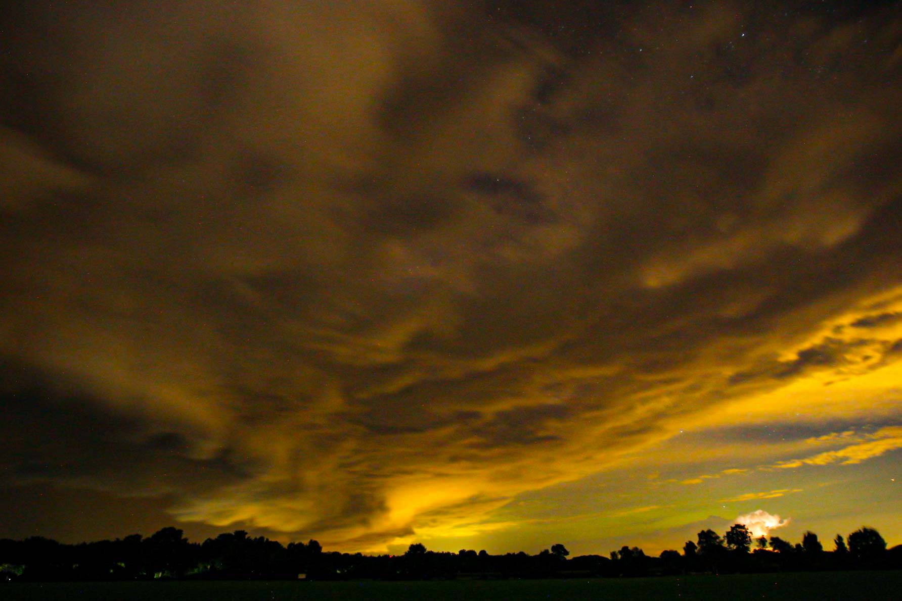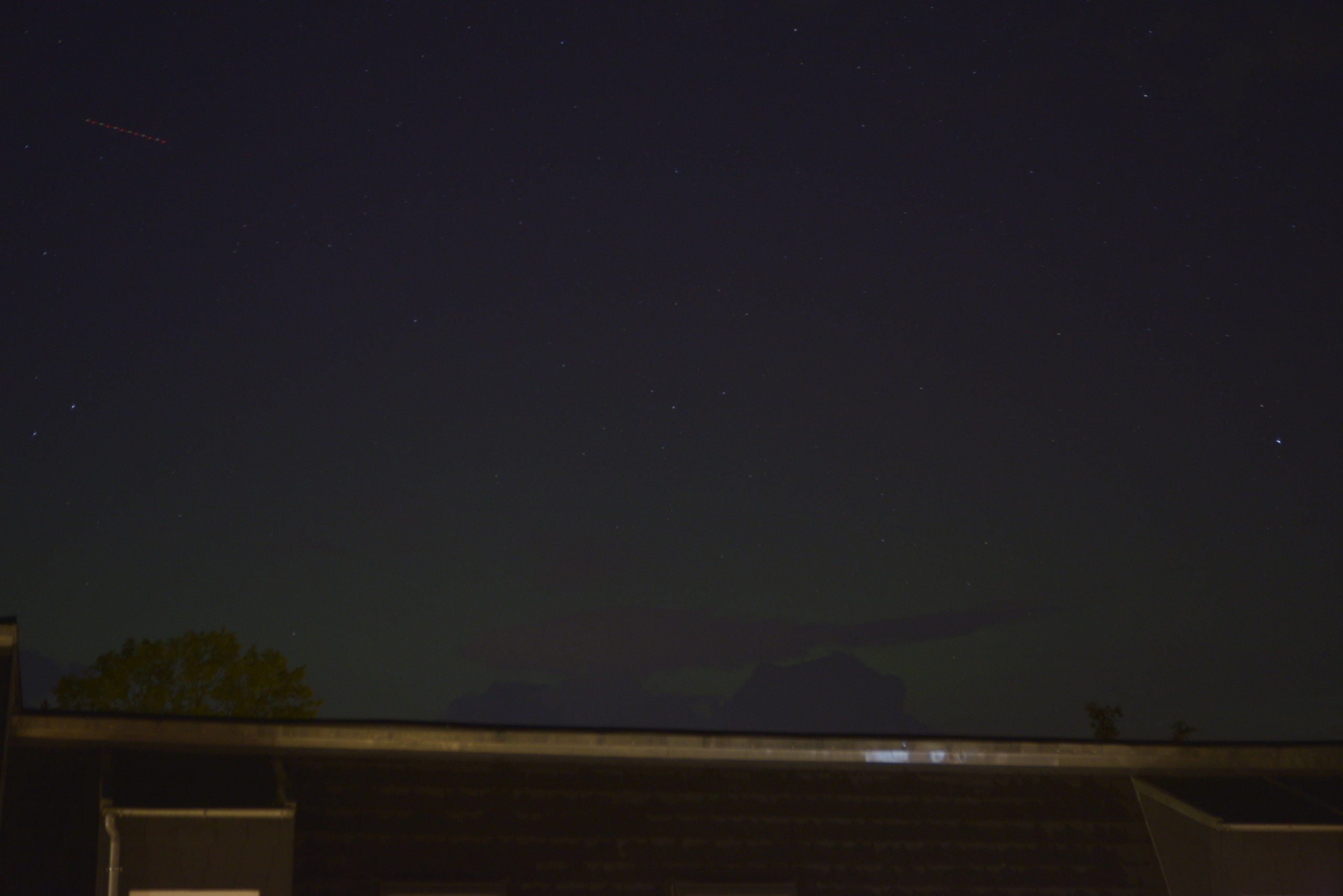 nachdem pünktlich zur Dunkelheit es sich hier zuzog, habe ich schon die Hoffnung auf mögliches Polarlicht aufgegeben. Doch gegen 22 Uhr riss es plötzlich unerwartet wieder auf, bevor die Front hier eintraf. Somit begab ich mich nach draußen zu meinem Beobachtungsort. In Richtung Norden konnte ich bereits fotografisch rotes Polarlicht festhalten. Das schöne dabei war, dass es immer wieder in die Richtung auch blitzte und das auch nicht gerade selten. Somit konnte ich zum ersten Mal Polarlicht zusammen mit Gewitter festhalten. Hier ein Bild von 22:23 Uhr MESZ: Etwas später intensivierte sich das Polarlicht und war dann, wenn es nicht mal zwischendurch blitze, als leichte Aufhellung am Nordhimmel visuell sichtbar. Hier ein Bild von 22:31 Uhr MESZ: Und eins noch von 22:34 Uhr MESZ ohne Blitz: Danach zog es sich ziemlich schnell zu, sodass ich dann abbrechen musste.